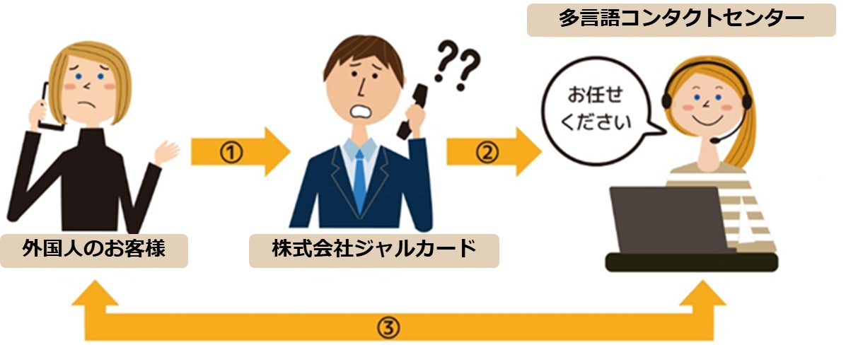 23年末時点で在留外国人数は340万人を超え、10年前に比べ約2倍まで増加しており、クレジットカードの加入者も増加傾向にあります。ジャルカードにおいても日本語が不自由な方からのお問合せに対する受付体制を拡充すべく、当社の多言語コンタクトセンターサービスを導入いたします。クレジットカード業界の知見を有する当社の通訳オペレーターがお客様のご要望やご意見、ジャルカードのコミュニケーターの回答を正確かつ迅速に通訳し、顧客満足の向上に寄与します。