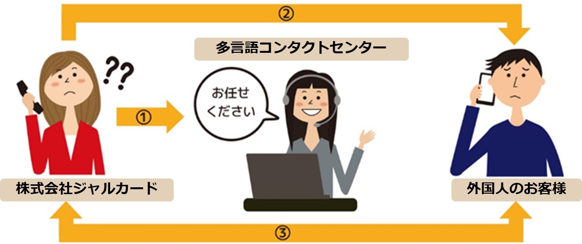 ジャルカードのコミュニケーターから当社の多言語コンタクトセンターへ発信し、通訳依頼