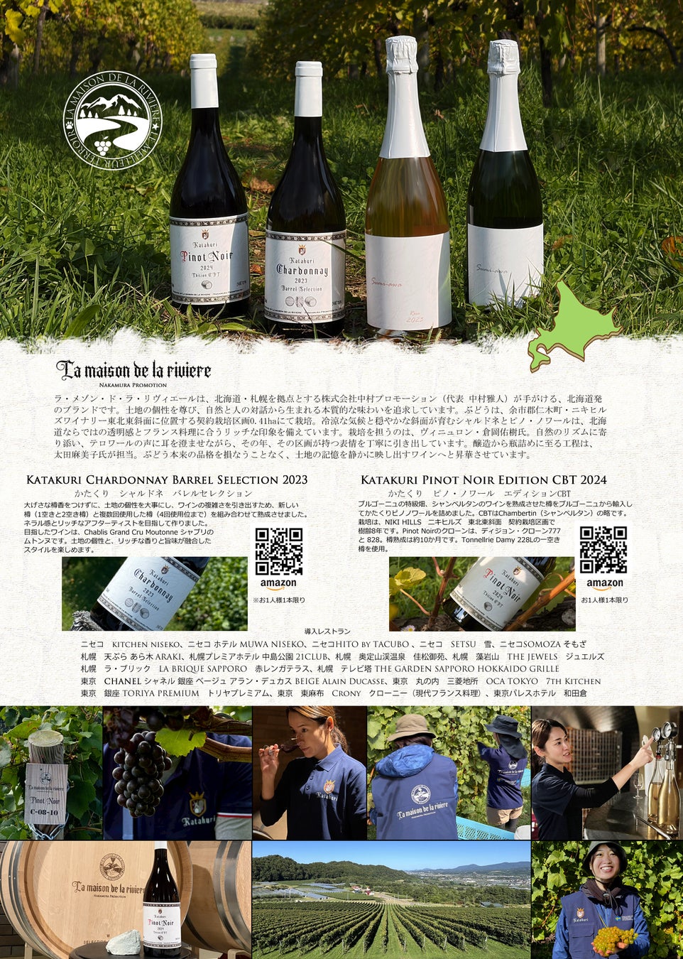 2.北海道のワイン 商品開発:北海道余市郡仁木町の契約栽培地0.4haにて、小ロット・高品質を志向した自社ブランド「La maison de la riviere ラ・メゾン・ド・ラ・リヴィエール」を展開。畑の個性やテロワールを尊重したワイン造りを行っています。