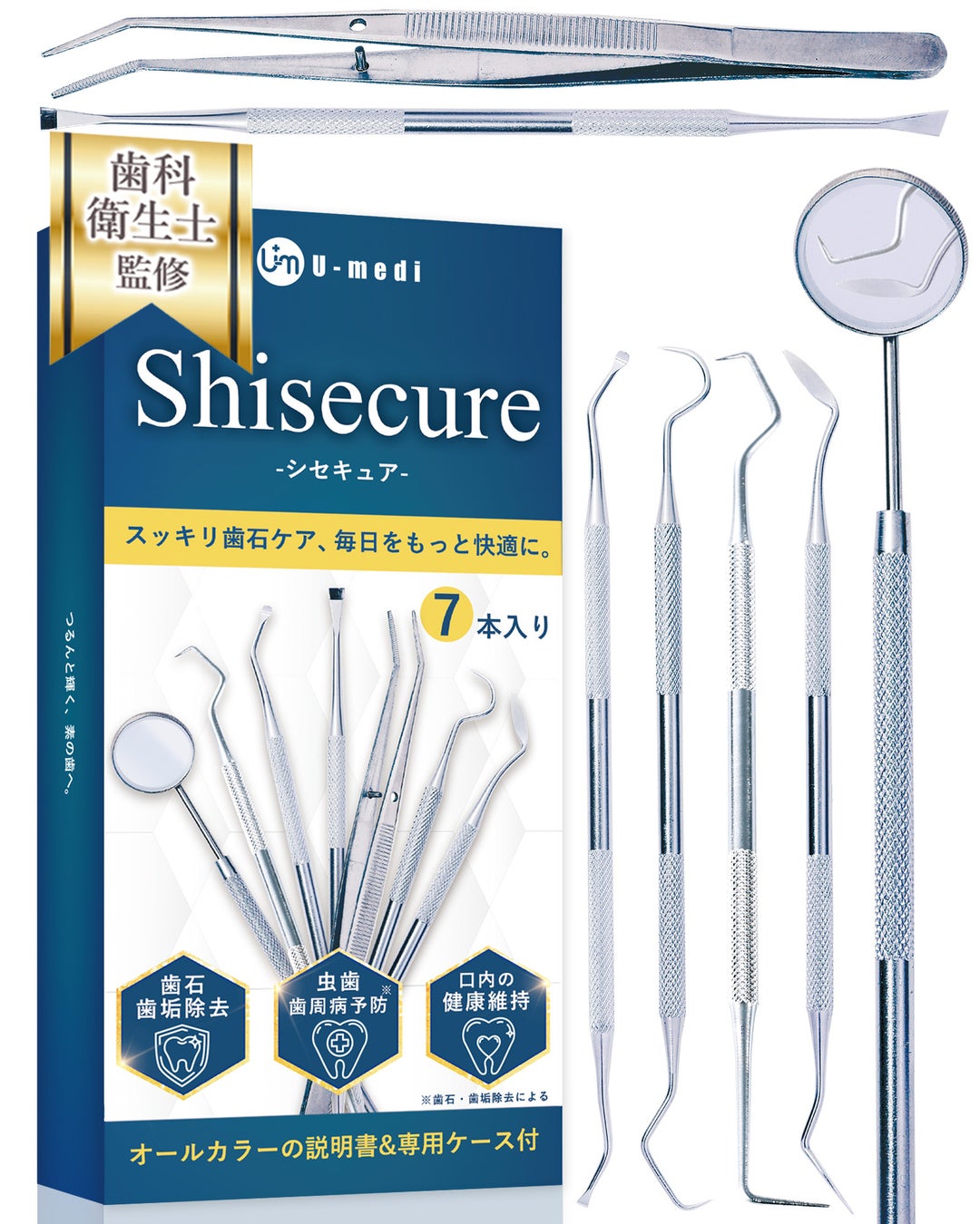 「シセキュア」は、歯科医院で使用される器具と同様の構造を持つスケーラーを中心に、デンタルミラーやピンセットを組み合わせた全7本の実用的なオーラルケアセットです。