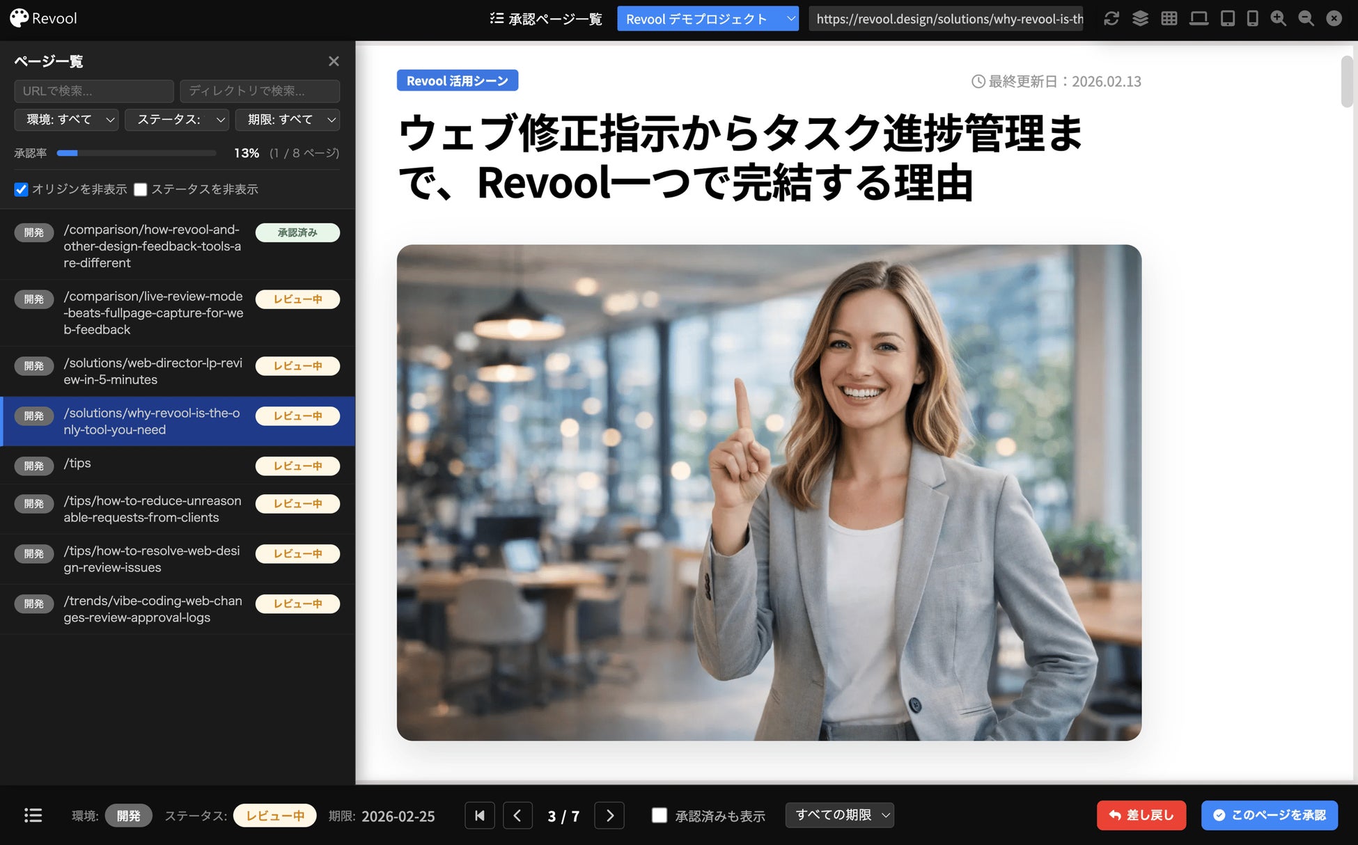Revoolは、もともとウェブ制作の現場の苦労を支援するために開発され、現在はレビュー、タスク管理、ページ管理、承認フローの統合を進めています。トリンフォワークスは既存リリースで、「ウェブ制作を、もっと楽に」という想いを掲げています。