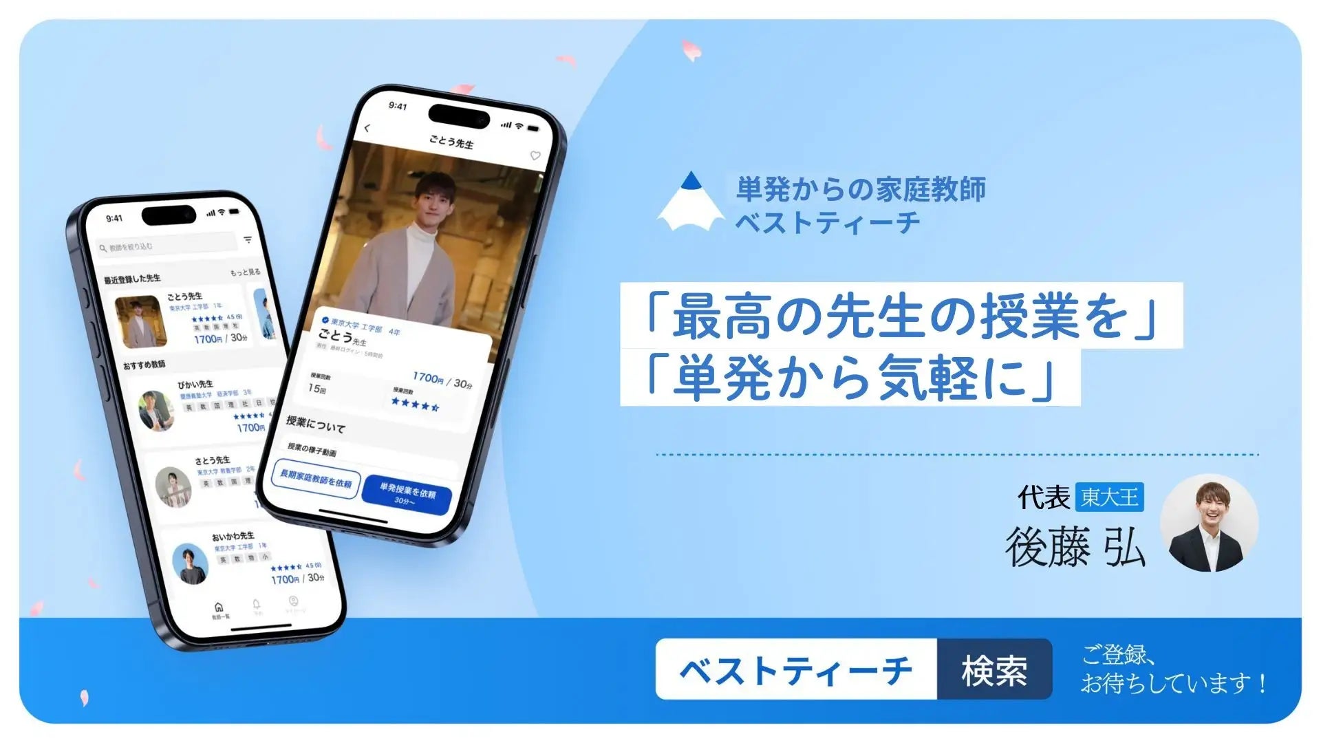 ベストティーチは、「最高の先生の授業を」「単発から気軽に」受けられる、新しい家庭教師サービスです。