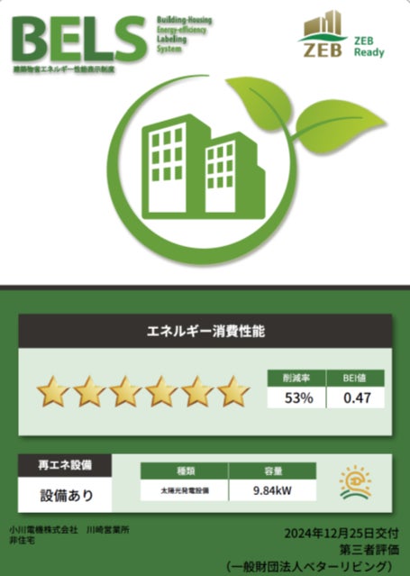 小川電機株式会社は、建築物の省エネルギー化と高効率化を推進する「ZEBプランナー」としての役割を果たし、持続可能な社会の実現に向けた取り組みを進めています。このたび、川崎事業所において「ZEB Ready」の認証を取得しました。これをモデルケースとして、再生可能エネルギーの活用や高効率設備の導入を通じて、環境負荷の低減とエネルギー効率の向上に取り組んでいます。