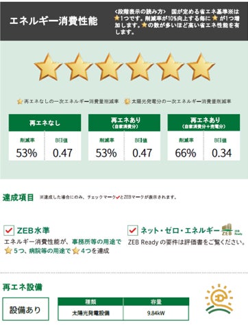 今回、新設する川崎営業所では、建物の高断熱化に加え、太陽光発電システム、高効率空調、DALI対応のLED照明、V2Hといった最新の創エネ・省エネ技術や設備を導入することで、一次エネルギー消費削減率53%、BEI値0.47を達成し、ZEB Ready認証を取得しました。