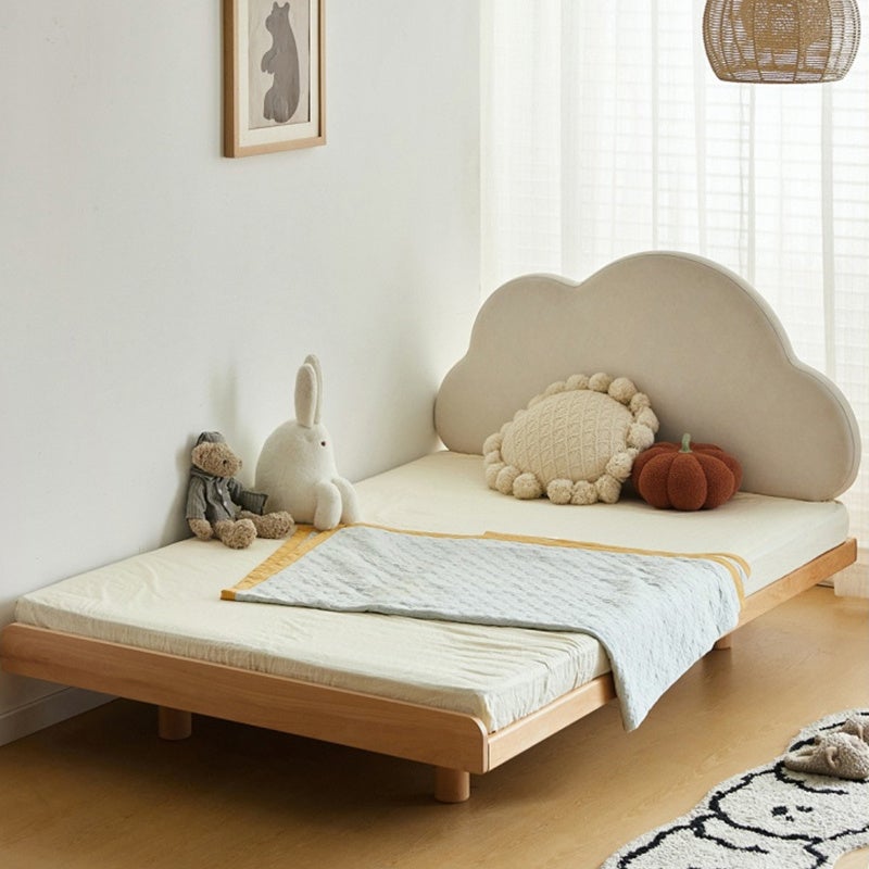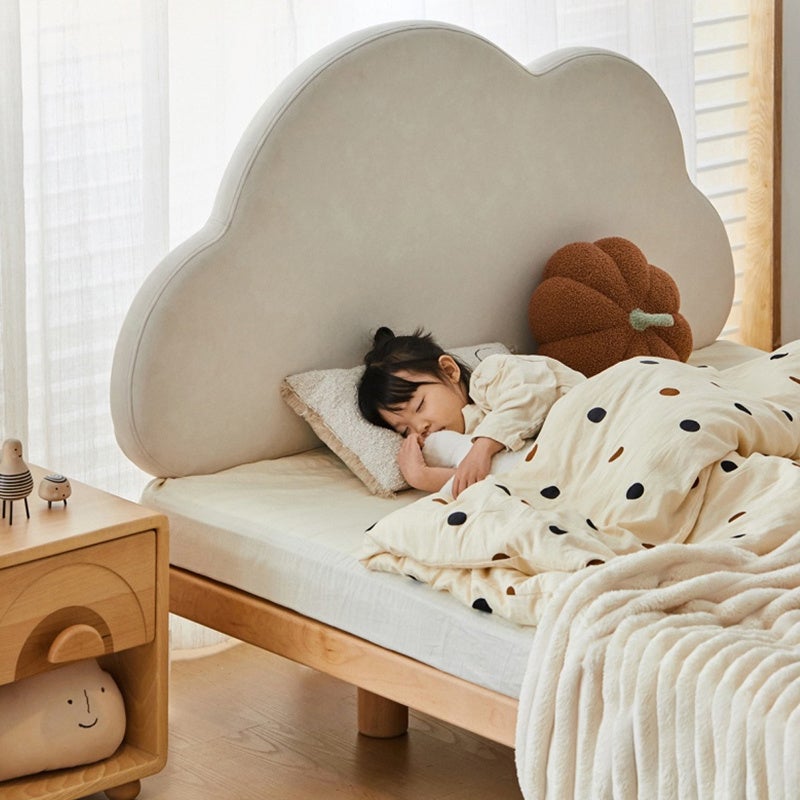 雲の形をモチーフにしたキュートなデザインのキッズベッド。ヘッドボードはクッション性がしっかりとあるので、頭や背中を優しくサポートしてくれます。作りが頑丈で安定感があり、飛び跳ねても安心。接着剤を一切使用せずにすべてのパーツが組み立てられているのも嬉しいポイント。