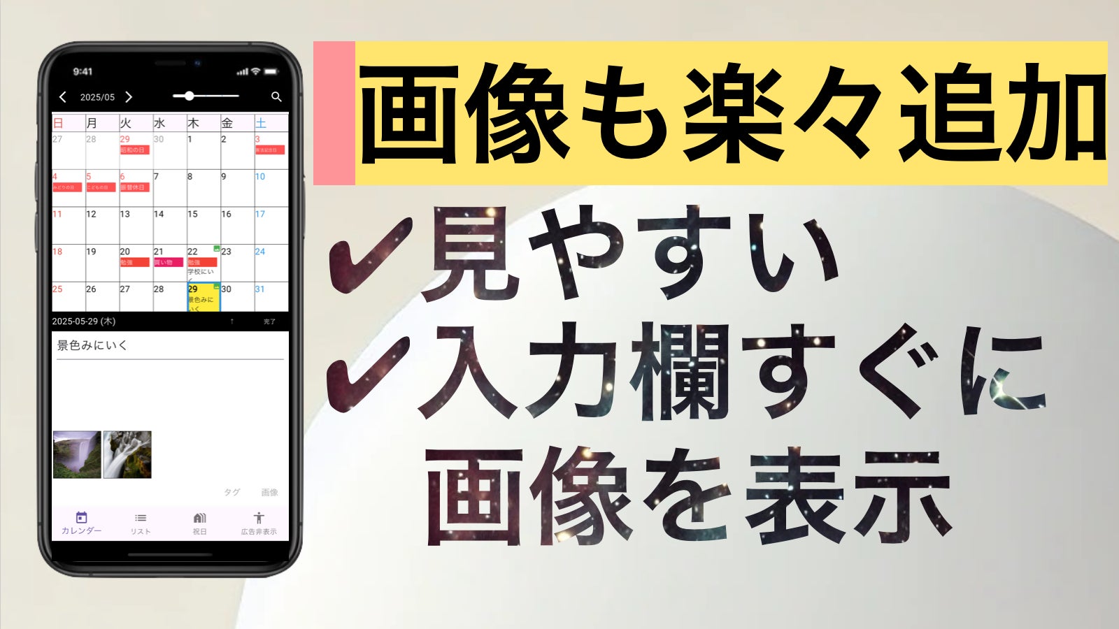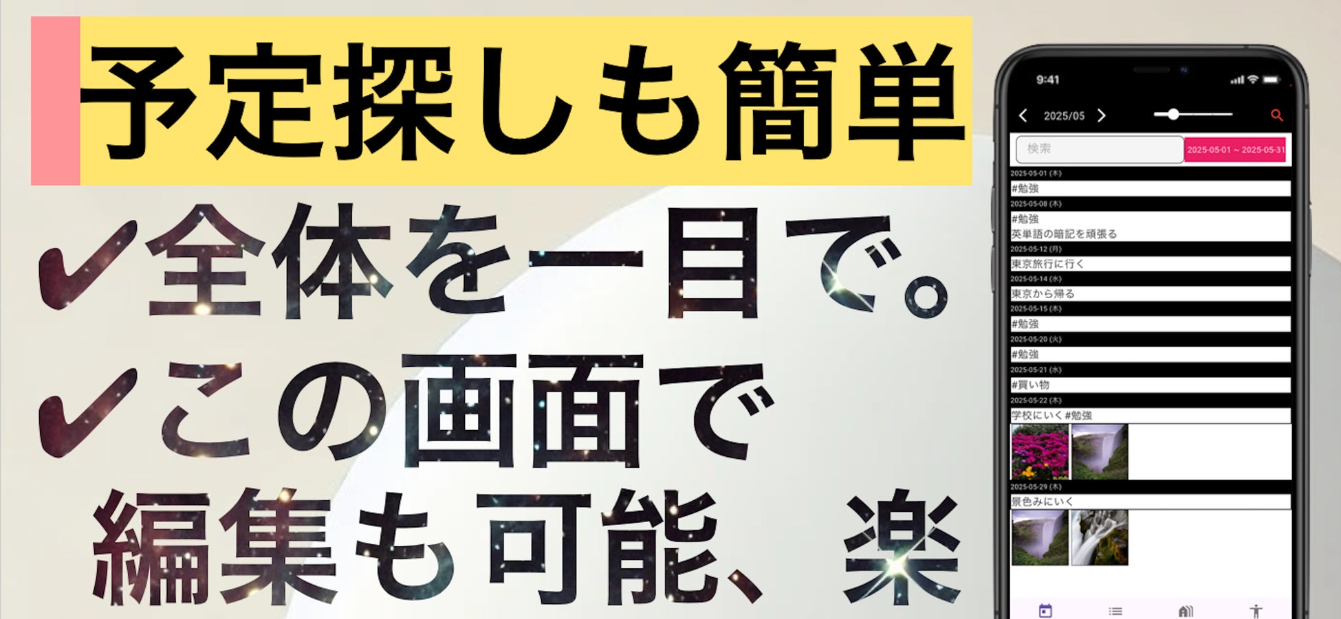 予定を見る、書く、探す。それを「1画面で」。──Calryは、“一画面主義”を貫く稀なカレンダーアプリです。今回、“シンプル”と“使いやすさ”を損なわずに、写真添付・タグ入力・検索機能を追加しました。
