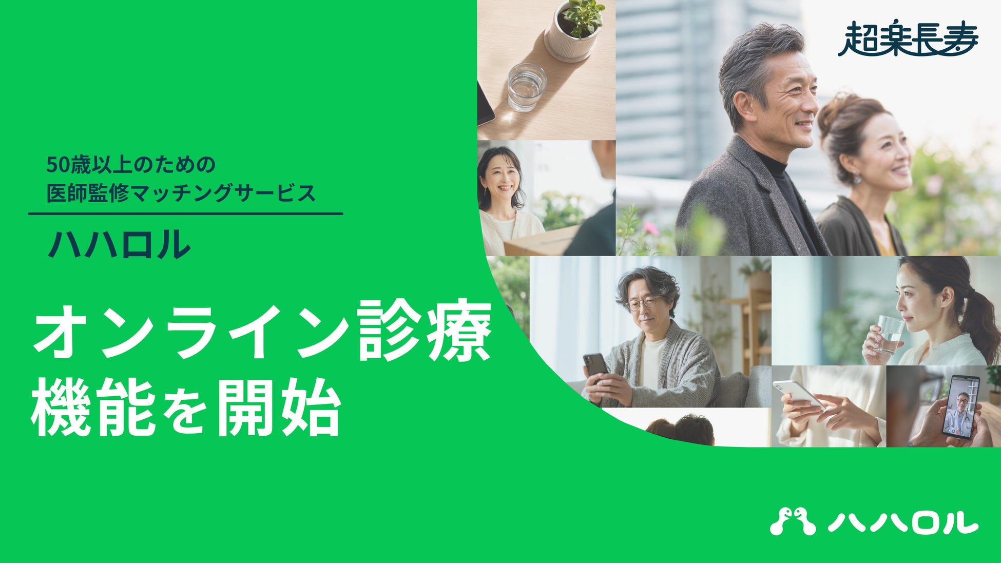 社会的孤独・孤立解消に関する事業を展開する超楽長寿株式会社(本社:東京都中野区、代表取締役医師:物部 真一郎、以下、超楽長寿)は、50歳以上のための医師監修マッチングサービス「ハハロル」において、オンライン診療機能「ハハロル オンラインクリニック」を4月9日(木)より開始いたします。