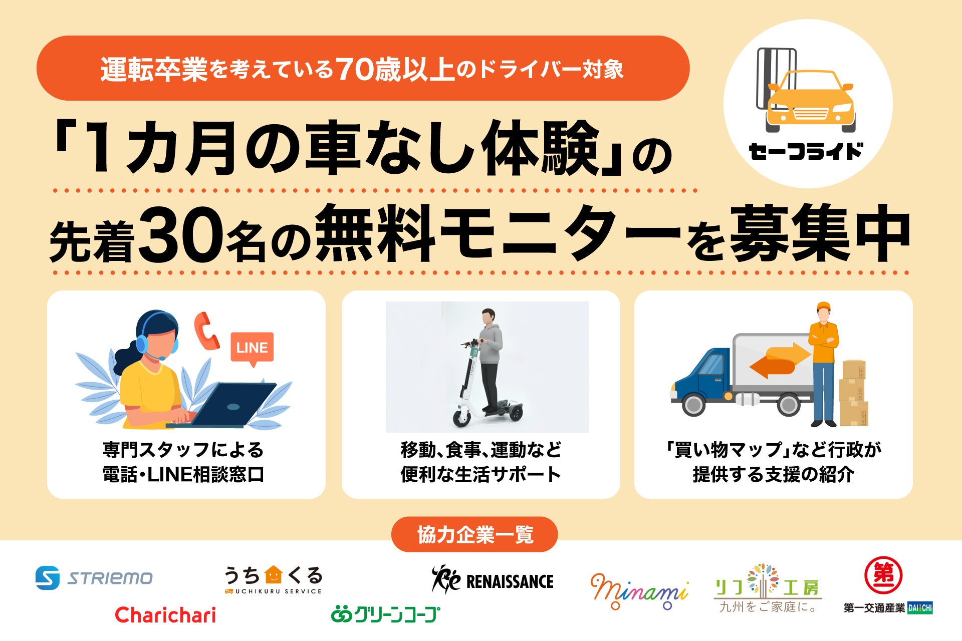 株式会社セーフライド(所在地:福岡県福岡市中央区、代表:山内紗衣)は、70歳以上のドライバーを対象に、「車を使わない生活」を1カ月間体験し、「車がなくても快適に暮らせる」という実感を得られるかどうかを検証する「おためし車なし体験」を、2025年12月より開始いたしました。この実証事業は、福岡市の「令和7年度ふるさと納税を活用したソーシャルスタートアップ支援」を活用して実施するものです。