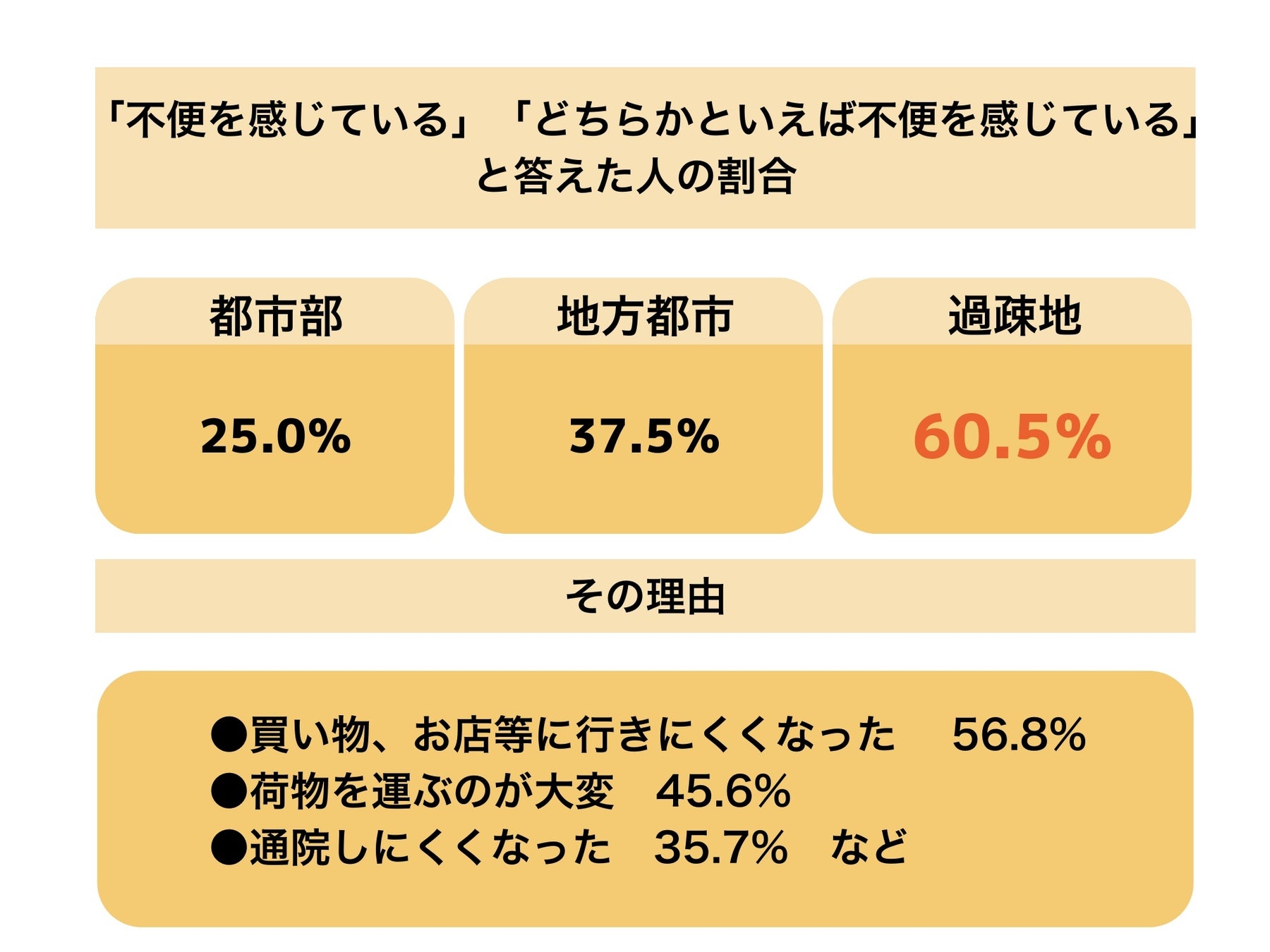 多くの高齢者が将来的に運転を卒業したい気持ちはあるものの、車に乗り続ける要因として、「生活が不便になる不安」が挙げられます。2021年に国が行った調査で免許を返納した人に聞いたところ、「返納後に不便を感じている」と答えた人は、都市部で 25%、地方都市で 37.5%である一方、過疎地では60.5% にのぼりました。<図3> 特に都市部から離れた地域ほど買い物や通院など日常生活に困りごとが増える傾向が明らかになっており、安心して車を手放せる環境づくりが求められます。