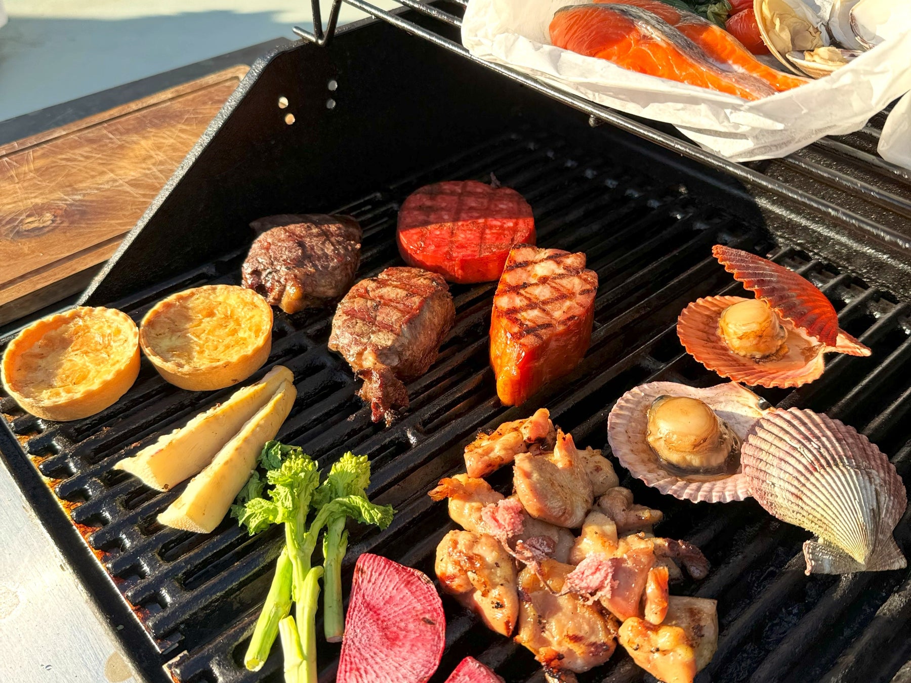 桜マスの紙包み焼き 50g/桜花塩漬けの鶏もも肉 100g/塩漬け豚ばら肉 80g/厚切り牛リブロース 150g/殻付きヒオウギ貝 1枚/ 春野菜のグリル(たけのこ、菜の花、紅芯大根) 1人前/桜海老のキッシュ 1個/ボロニアソーセージ 80g/桜マシュマロ 1個