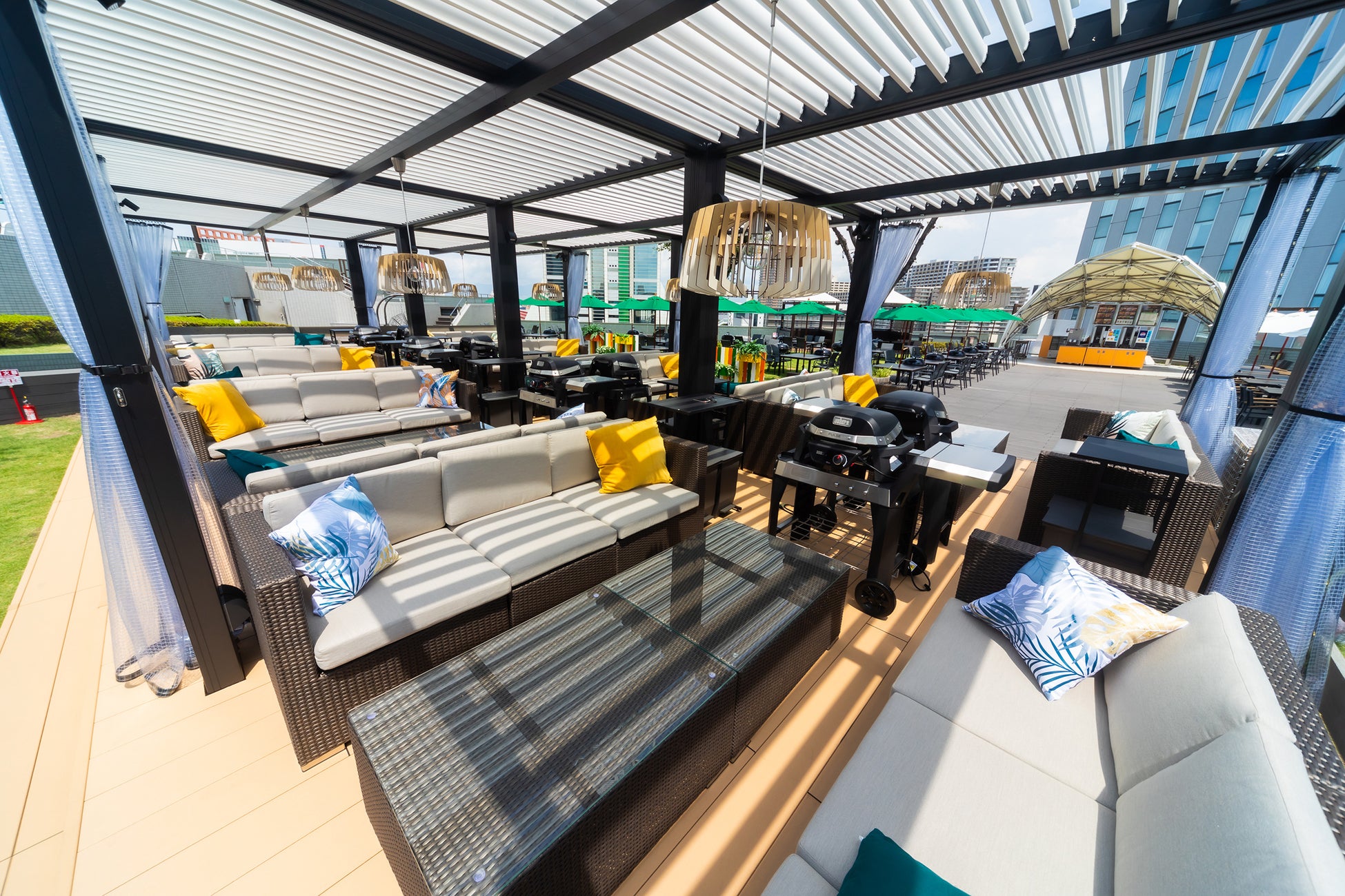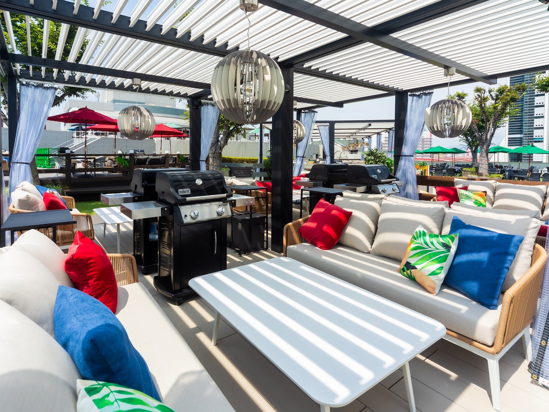 「THE ROOF TOP BBQ SUNNY SQUARE OSAKA BAY」は、"WORLD(ワールド)BBQ ~世界のアウトドア空間を一つの場所に~"をコンセプトに掲げ、異なる国々のBBQスタイルと文化が交わる特別な体験と交流の場を提供するアウトドアリビング空間です。4か国のBBQスタイルをエリアごとに表現し、それぞれの国の特色を反映したアメリカンガスグリル・蓋付きチャコールグリル・スマート電気グリル・炭式の囲炉裏型コンロなど、多彩なBBQグリルを完備。本格的なBBQをここ一か所で体験できるのも魅力の一つ。お客様は世界各国のBBQの味を堪能でき、次回は別のエリアも楽しみたくなるような魅力ある施設となっています。