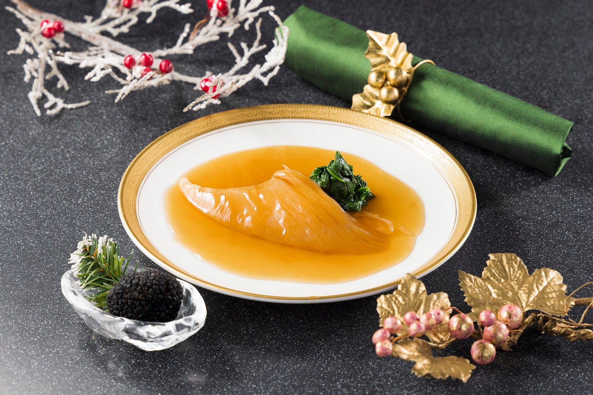 クリスマス期間には、大切なひと時を最高の夜景と中国料理でお客様に楽しんで頂くために、ふかのひれの姿煮込みや金目鯛の炒め物、北京ダックなどの王道の料理に、クリスマス仕様の前菜やパフェ、蟹と雲丹のクリーム焼きなど、季節感たっぷりの贅沢なコースメニューをご用意いたしました。