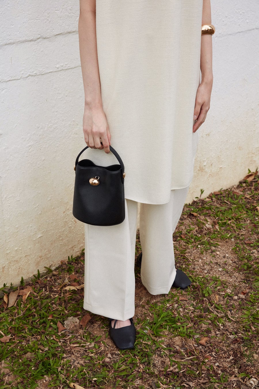 イタリア製⾼級テクスチャード⽜⾰を使⽤したバケツバッグ「Egg Bucket」は今回ポップアップにて、定番人気のBlackとMushroomカラーから、Dark Rosewoodカラー、これからの夏にぴったりなラフィア素材のStrawカラーまで、4⾊を展開しています。春夏のシーンに合わせて、色味と素材をお選びいただけます。