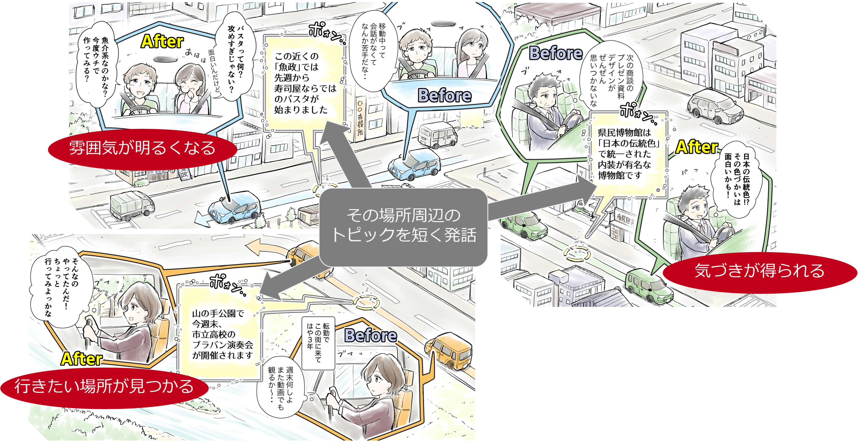 地域トピック案内アプリ"Bashow"は、今後、利用者の属性・趣味嗜好はもちろん、場所、時間、天気などリアル環境のデータに基づいてトピックを出し分ける、タイミング判断機能を搭載します。このタイミング判断機能は当社独自のAIであり、リアル環境に基づいてコンテンツをレコメンドする機能は世界的にも類例がないと捉えています。今後、このタイミング判断機能を用いて、他のエンタメ企業等とともに移動中ならではアプリやサービスを構築したり、車載アプリ市場の基盤システムとすることを目指しています。