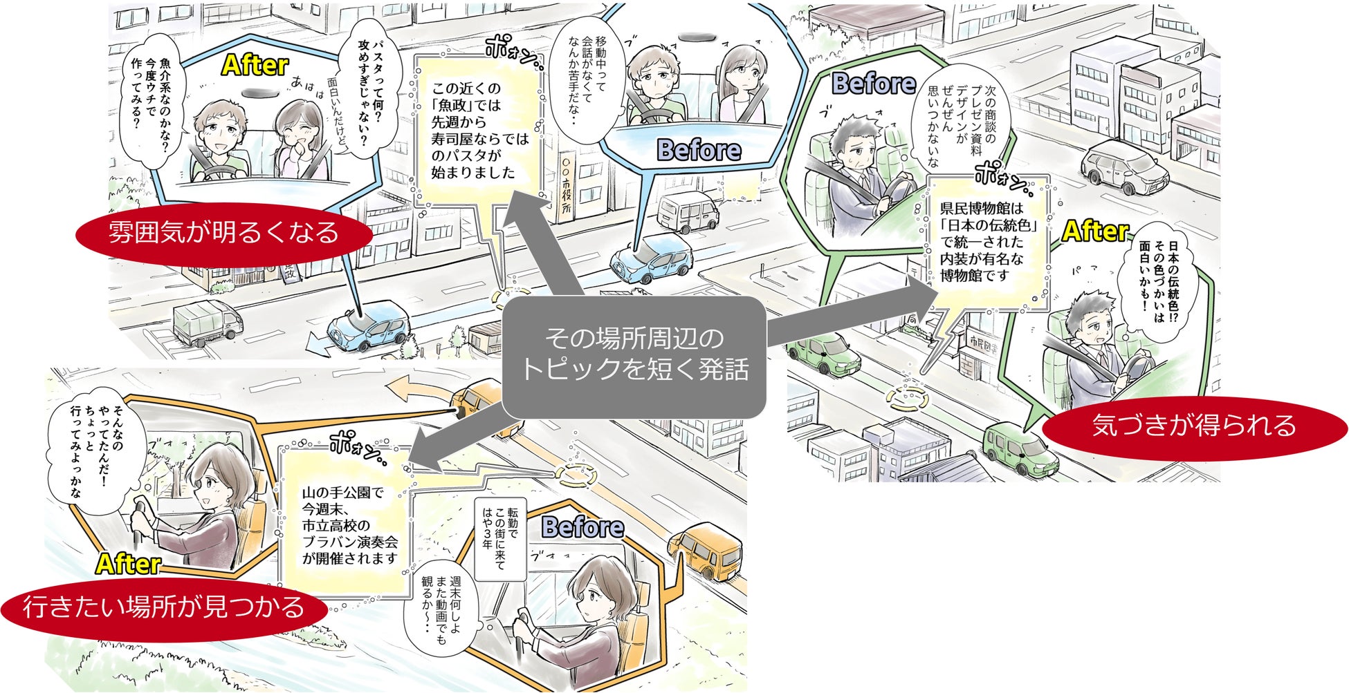タイミング判断機能の構築と運用 地域トピック案内アプリ"Bashow"は、今後、利用者の属性・趣味嗜好はもちろん、場所、時間、天気などリアル環境のデータに基づいてトピックを出し分ける、タイミング判断機能を搭載します。このタイミング判断機能は当社独自のAIであり、リアル環境に基づいてコンテンツをレコメンドする機能は世界的にも類例がないと捉えています。今後、このタイミング判断機能を用いて、他のエンタメ企業等とともに移動中ならではアプリやサービスを構築したり、車載アプリ市場の基盤システムとすることを目指しています。