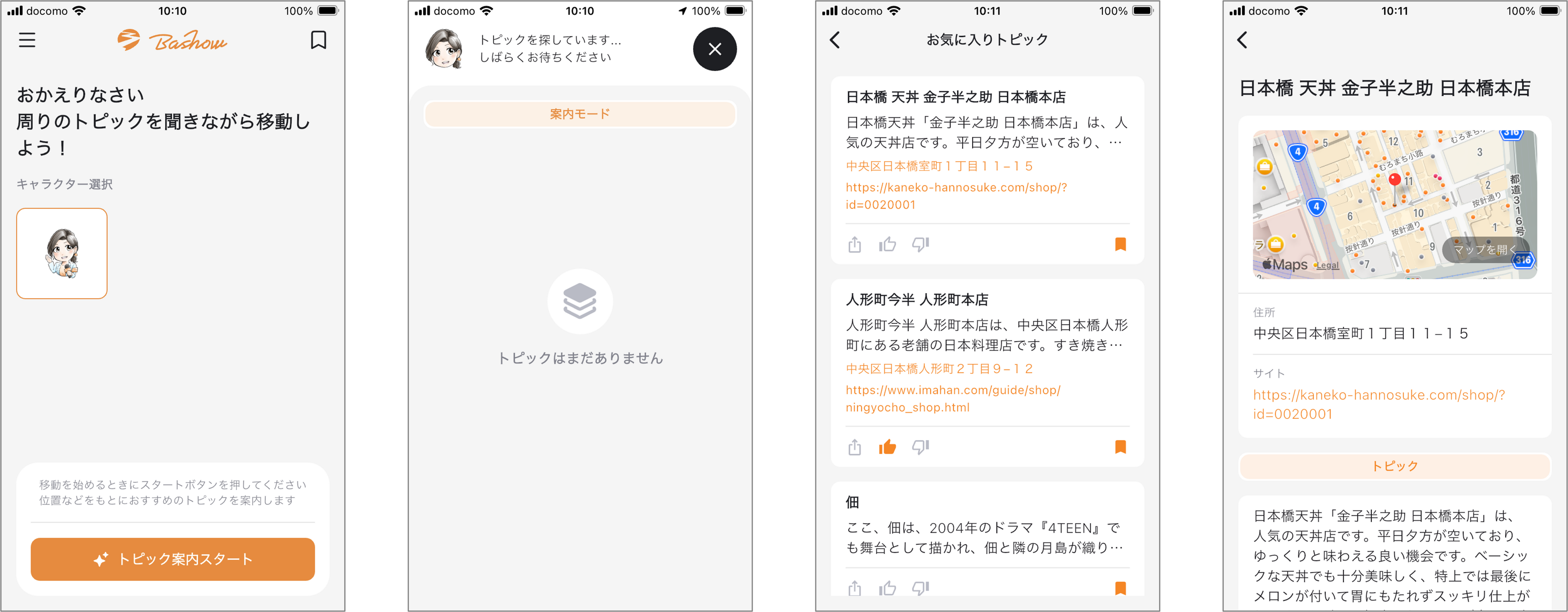 地域トピック案内アプリ"Bashow"の使い方はシンプルで、アプリを起動してスタートボタンを押すだけです。その後、移動中に、その場所周辺のトピックを、数分に一回、15秒程度の短い音声で案内します。トピックとは、「そこの○○というお店では○○が人気」「この近くの○○神社には……という歴史がある」など、お店や地域のちょっとした情報です。様々なトピックを聞き流すことで、新たなお店との出会いや、地域への愛着をもたらし、関心の幅を広げるという価値を提供します。