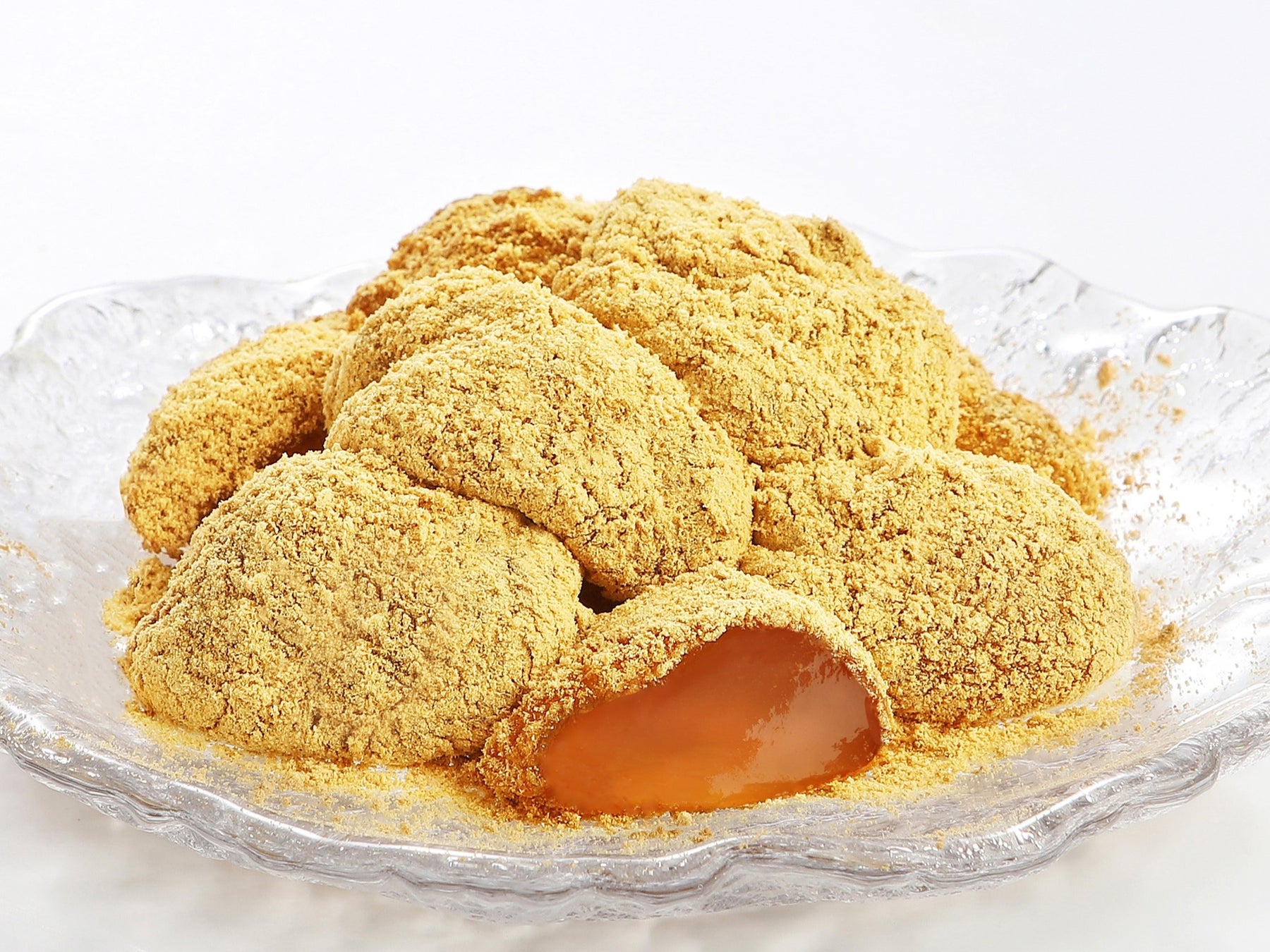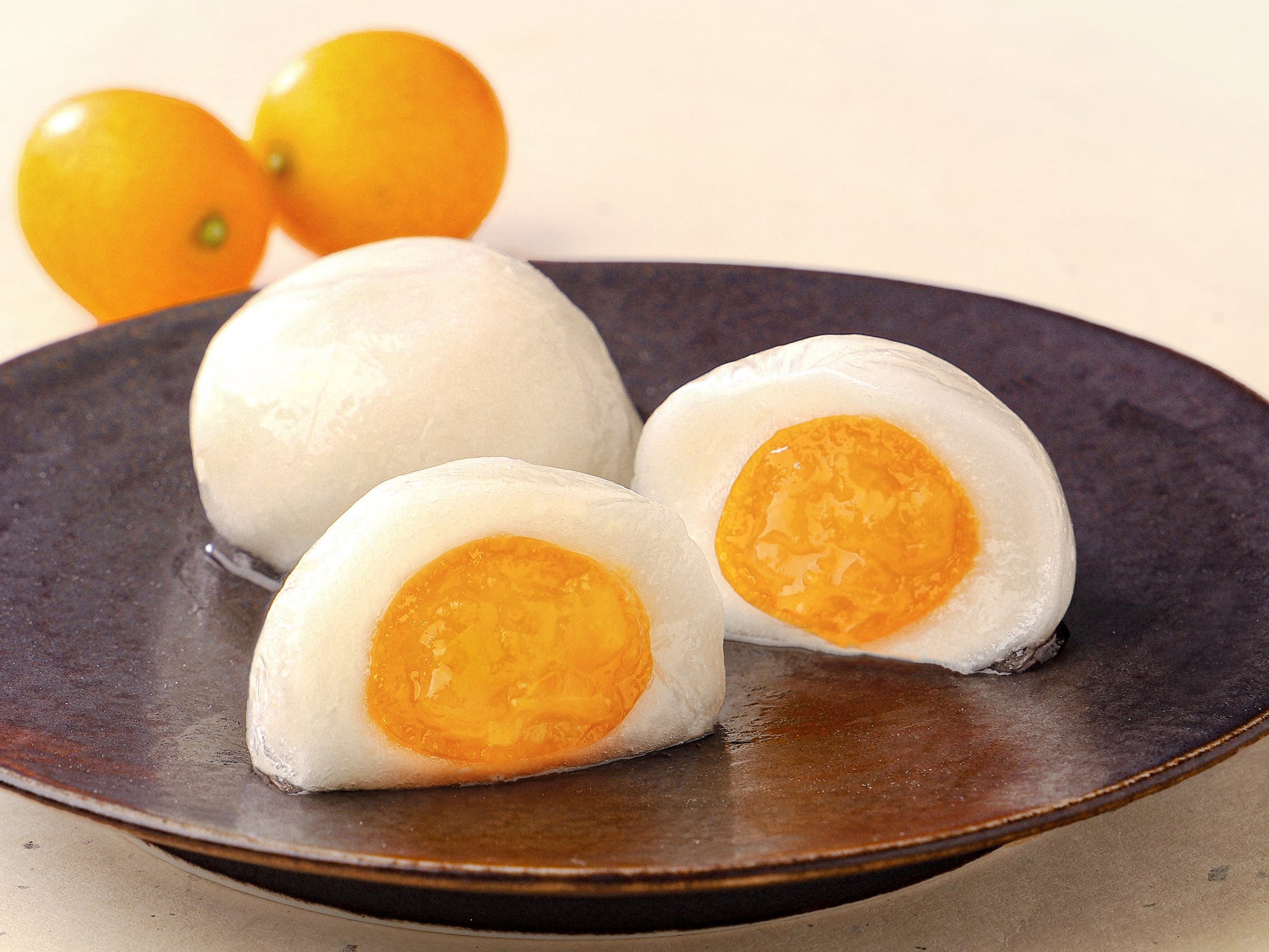 蜜漬けした金柑をふわっとした口当たりの羽二重餅で包んだ「へそくり餅」は、金柑を小判に見立て、絹の羽二重で包み隠す様子からと名付けられました。羽二重餅の上品な甘みと金柑のほろ苦さがくせになる逸品です♪