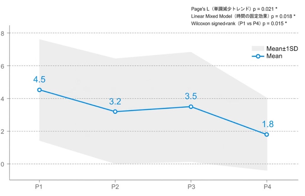 ユーザーとQX Engine間の対話テキストに基づき、大規模言語モデル(LLM)を用いて抑うつ指標であるPHQ-9スコアを推定しました。全実験期間を4つの期間(P1–P4)に区分し、各期間におけるスコアの推移をプロットしたところ、QX Engineの使用に伴いうつ傾向が大幅に改善されていることが分かりました。