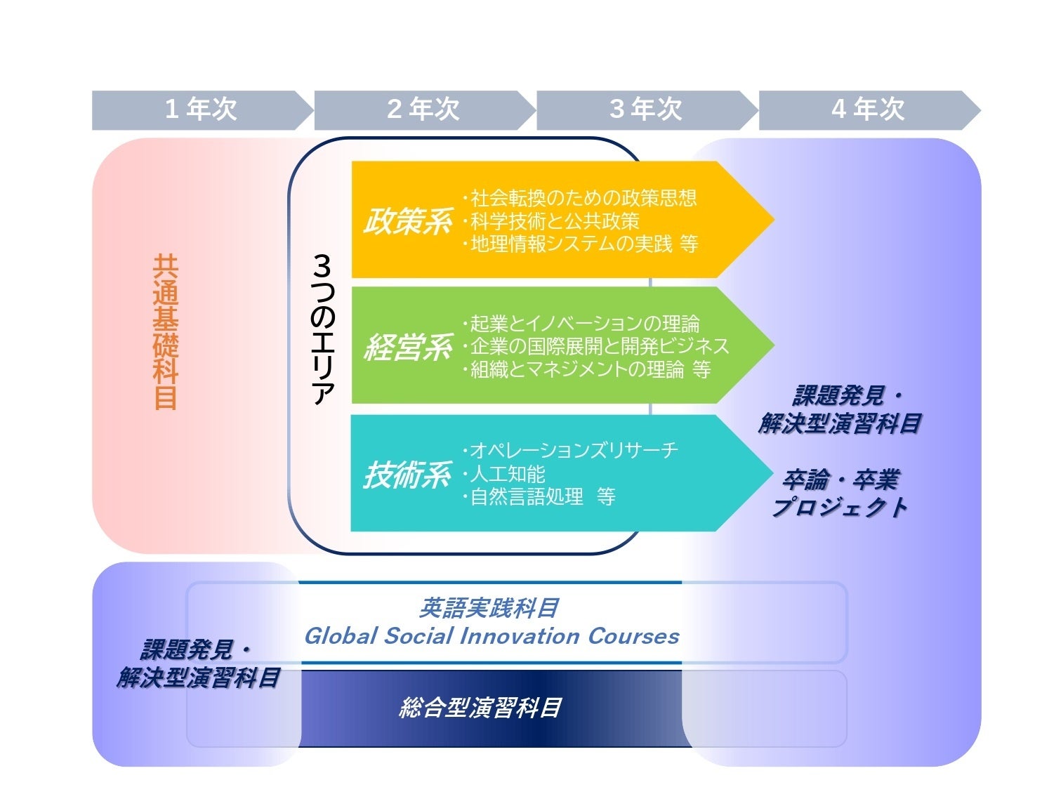 ①情報技術、言語スキルや経営学・政策科学の基礎的知識・技能修得