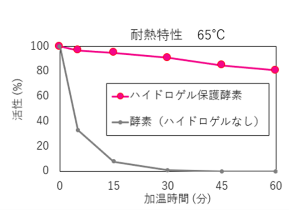 アメーバハイドロゲルを酵素に被覆させる技術「Gel Coat™」を用いると、65℃という高温環境や有機溶媒中、長期間の室温保存、凍結融解を繰り返す過酷な条件下でも高い残存活性を維持します(図2、図3)。Gel Coat™は、特許成立済みおよび多数の特許出願により、知的財産面でも強固な競争優位性を確保しています。