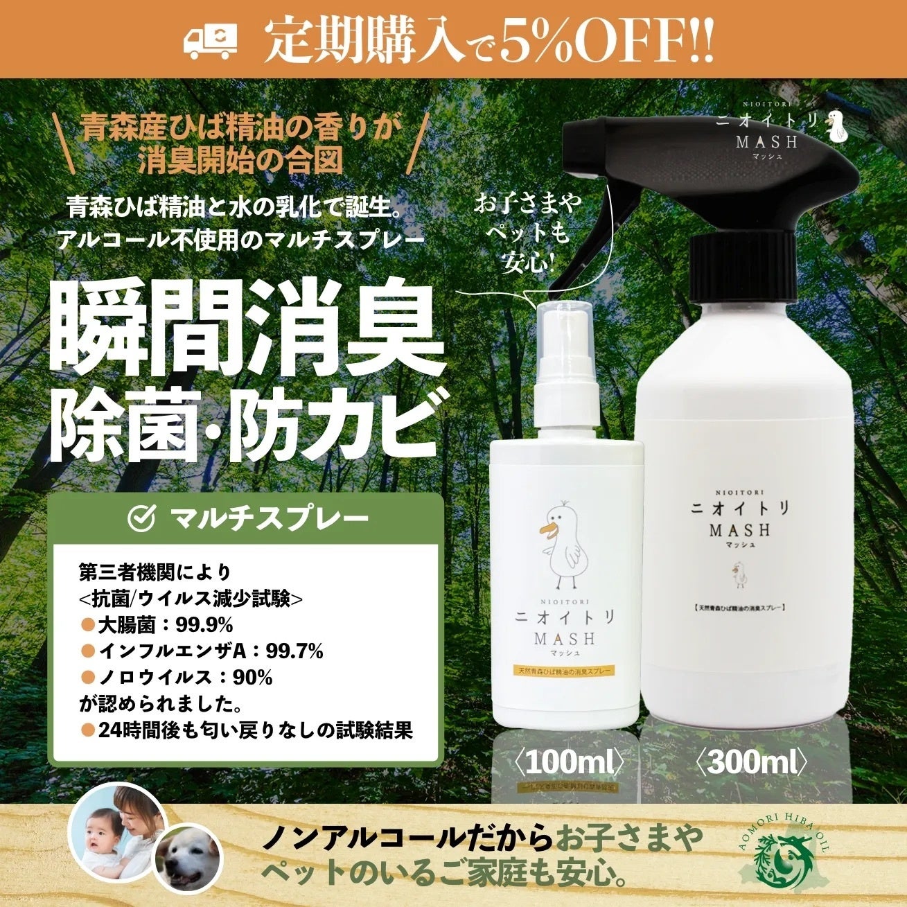 青森ひば精油を使用したマルチ消臭スプレー「ニオイトリMASH 100ml」が特別価格で提供されます!