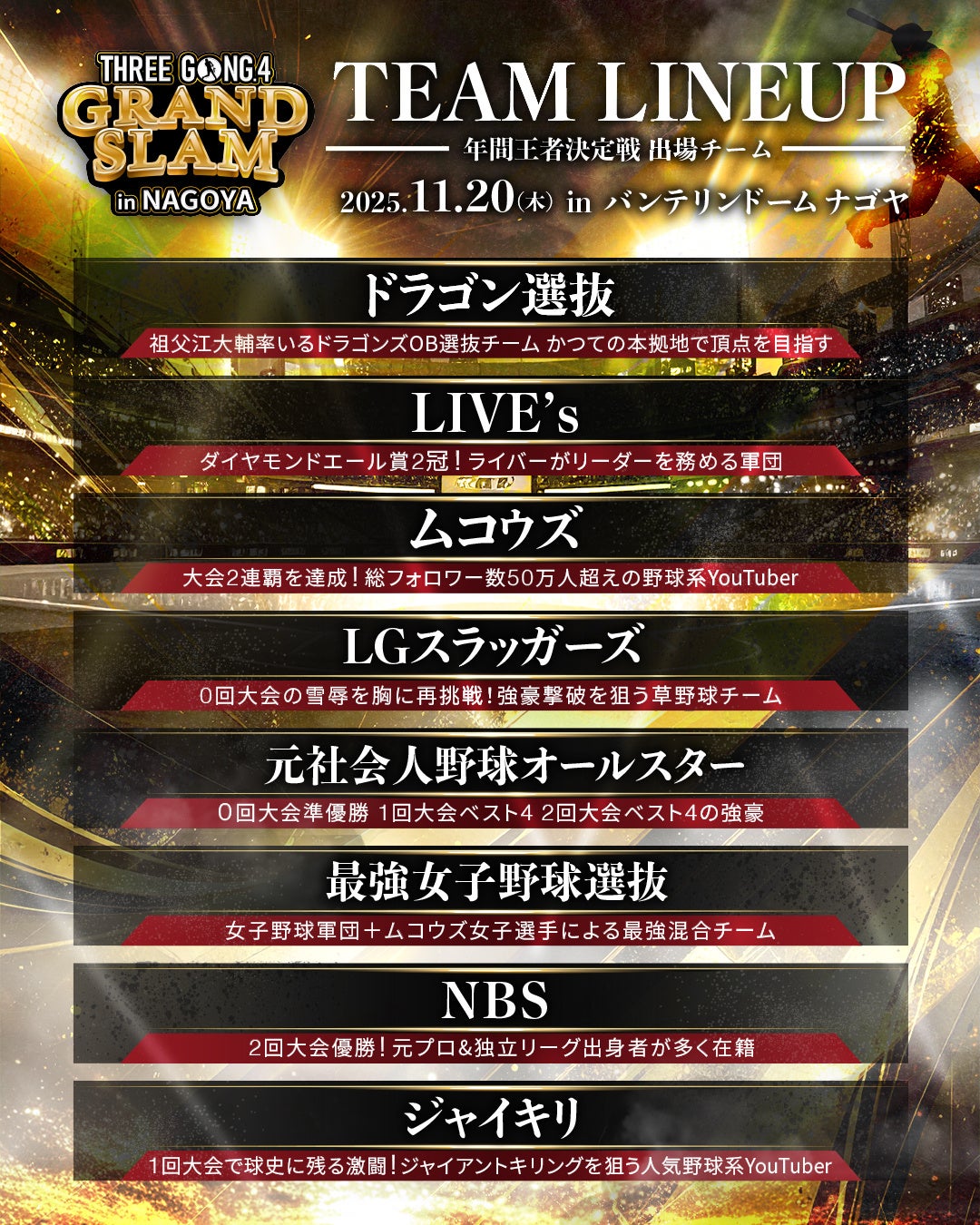 2025年11月20日(木)にバンテリンドーム ナゴヤにて開催される「THREE GONG.4 -GRAND SLAM- in NAGOYA」。この度、祖父江大輔さん率いる中日ドラゴンズOBにより結成される「ドラゴン選抜」の参戦が決定! 「ドラゴン選抜」のチームメンバーや大会概要をお届けします。