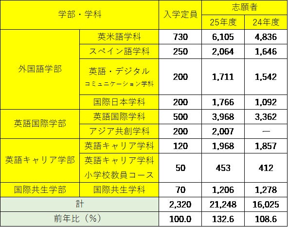 学科別の志願者は、新設の英語国際学部アジア共創学科は2007人で、2024年に設置した同国際日本学科は1766人(1092人)でした。そのほか▽外国語学部英米語学科6105人(4836人)▽同スペイン語学科2064人(1646人)▽同英語・デジタルコミュニケーション学科1711人(1542人)▽英語国際学部英語国際学科3968人(3362人)▽英語キャリア学部英語キャリア学科1968人(1856人)▽同学科小学校教員コース453人(412人)▽国際共生学部国際共生学科1206人(1278人)でした。