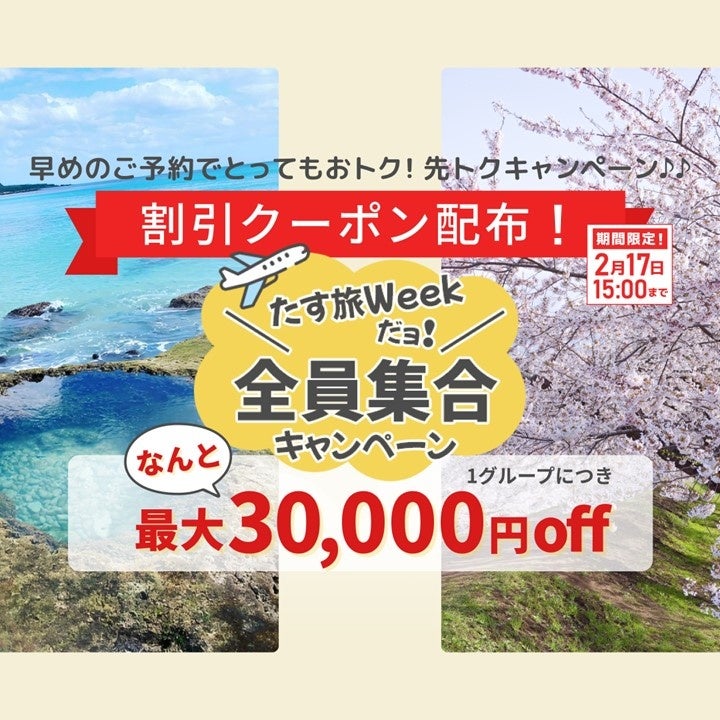 最大3万円OFFクーポンを配布!GW・夏休み・推し活など人気の日程は早い者勝ち!10月25日帰着分まで販売中!