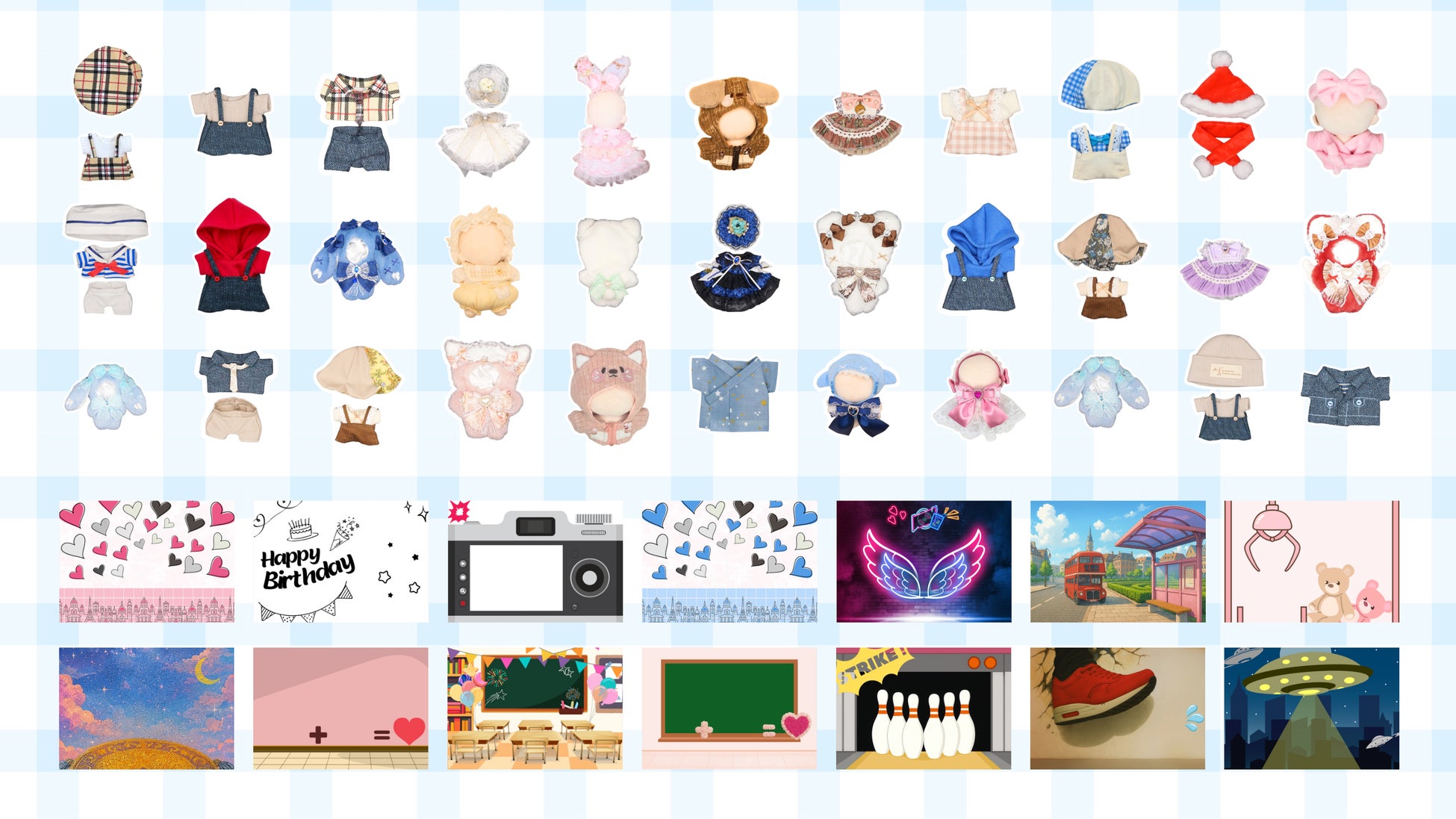 ▼試着・撮影できるぬい服・オリジナルぬい撮りパネル一覧(一部抜粋)