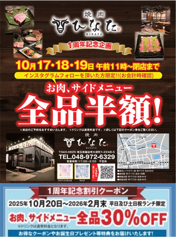 厳選した黒毛和牛A5ランクのみを使用した「焼肉ひなた」(所在地 : 埼玉県越谷市大成町1丁目2248-5)は、10月18日で1周年を迎えることとなりました。1周年を機に限定フェアを実施しますのでお知らせいたします。また、この3日間にご都合の合わないお客様向けに特別クーポンもご用意致しました!!