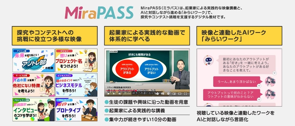 「MiraPASS」は、これらの課題を解決するために開発されたデジタル教材です。生徒は、第一線で活躍する起業家による実践的な映像コンテンツを視聴し、ビジネス創造や社会課題解決のリアルな視点を学びます。