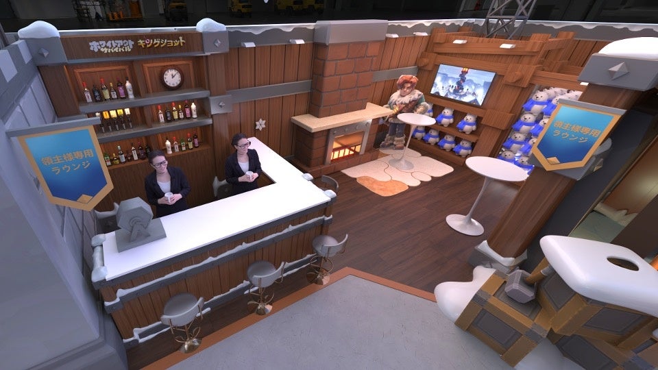 会場内では 裸眼3Dディスプレイを用いたインタラクティブ映像を展開。『ホワサバ』や『キングショット』の世界観を、リアルな建築・雪氷演出・光の演出で再現。