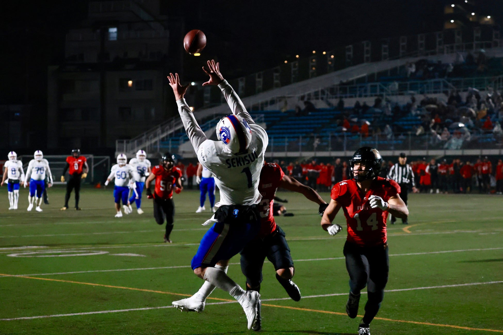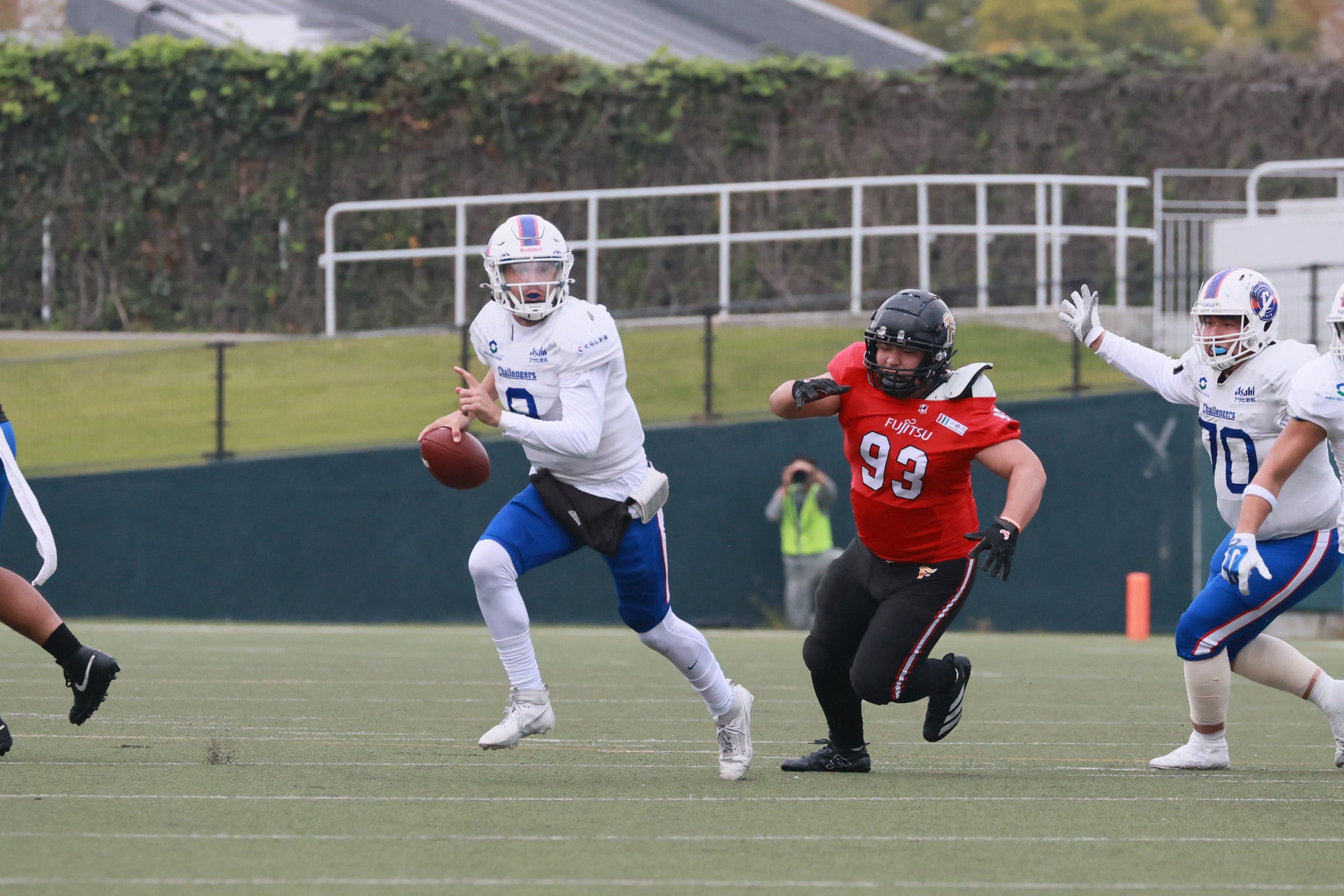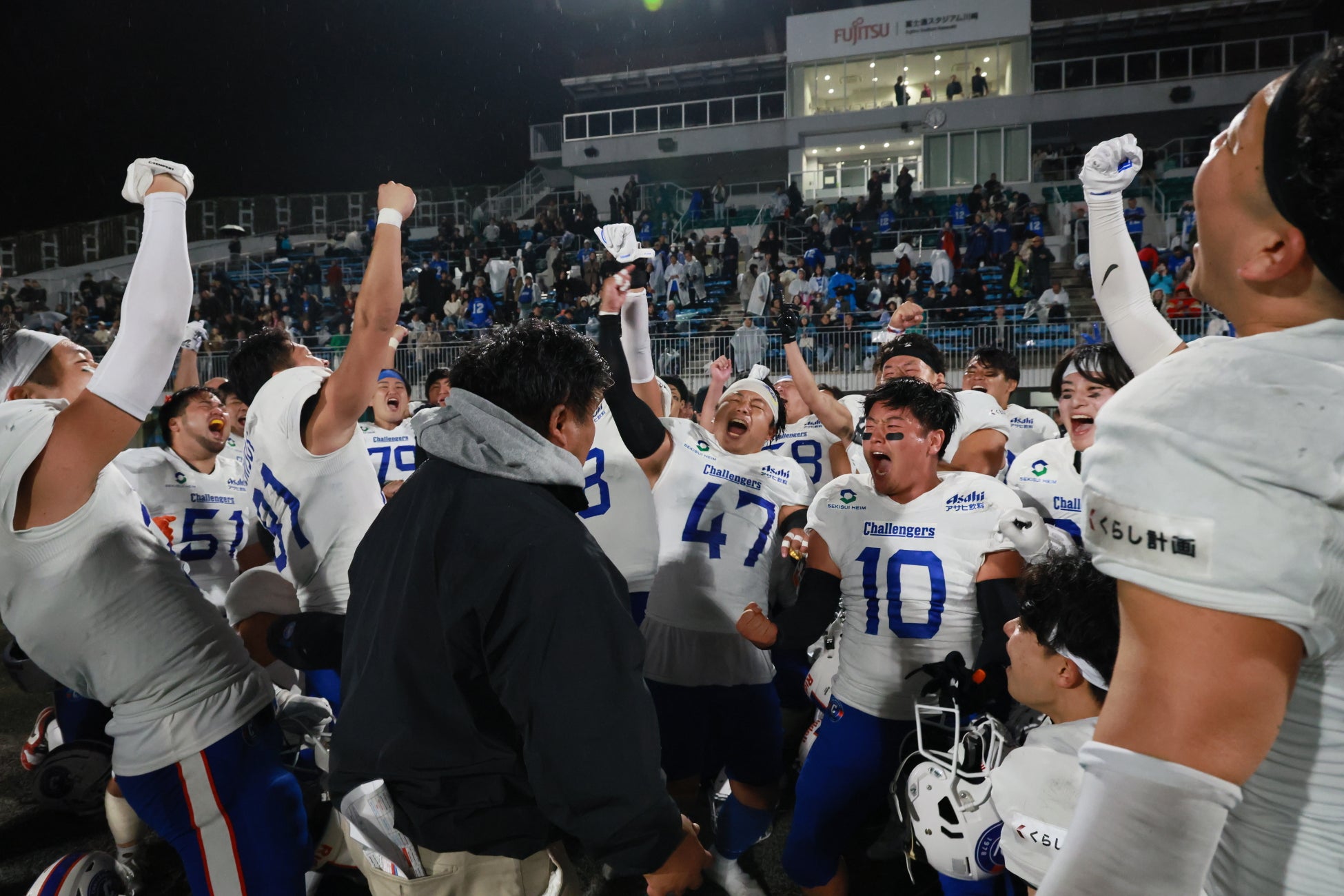 11月9日に行われたレギュラーシーズン第6節。相手は一昨年まで4連覇を誇った王者・富士通フロンティアーズ。SEKISUIチャレンジャーズは、激しい点の取り合いの末、試合残り9秒で劇的な逆転タッチダウンを決め、34-32で歴史的勝利を記録。