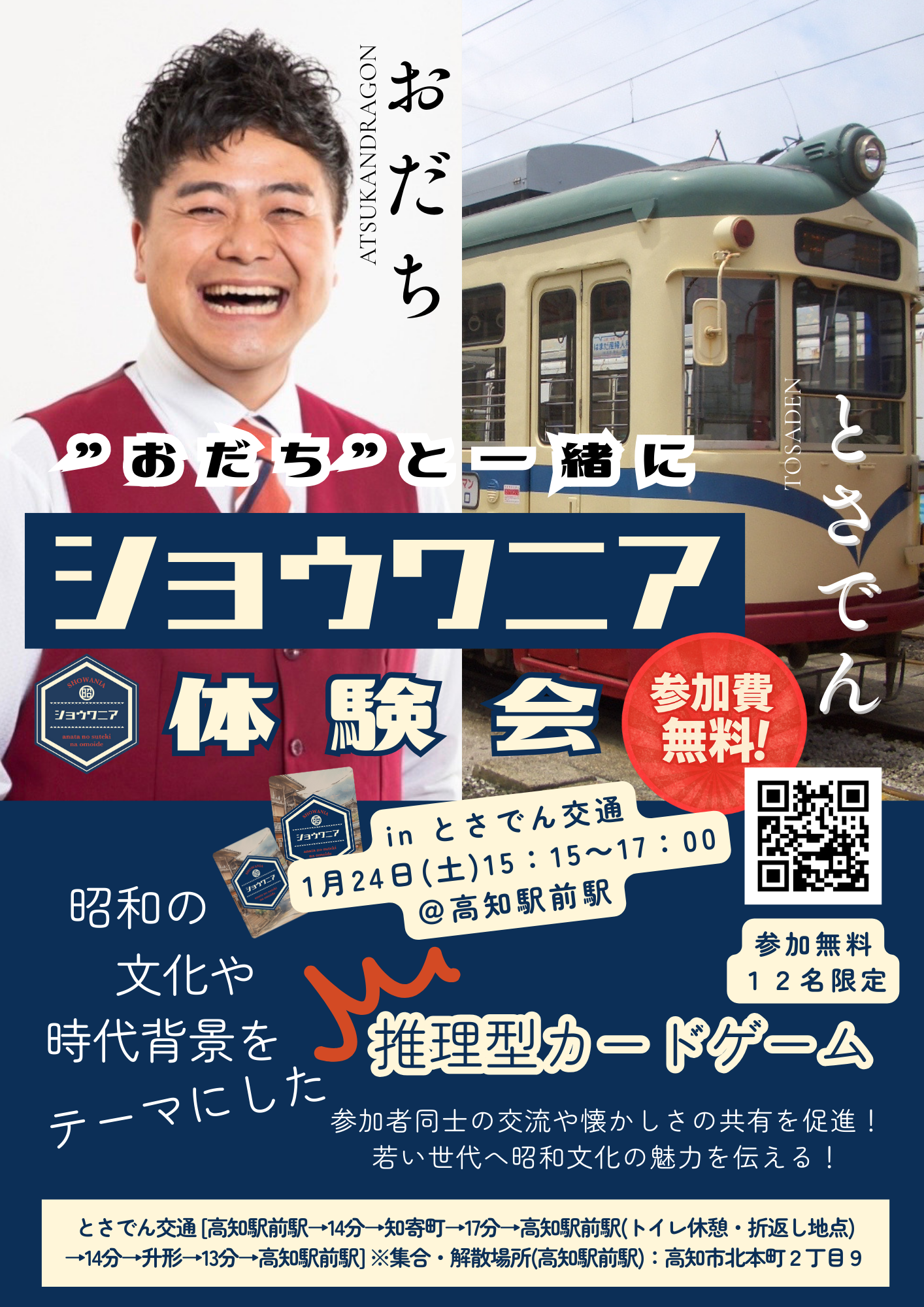 埼玉県東松山市の徳田真人と申します。私が代表を務める株式会社ユーズドネットが株式会社LODU(本社:石川県、代表取締役:島田高行)と開発した、高齢者の「思い出」を引き出し語り合うことで、世代を超えた交流や心の活性化を促す新しいカードゲーム「ショウワニア」の体験会を1月24日に、とさでん交通の昭和レトロな路面電車を貸し切りして行います。今回の体験会のスペシャルゲストとして、超高齢社会高知県を拠点に四国で活動しているフリーのお笑いコンビのあつかんDRAGONおだちさんが参戦されます。