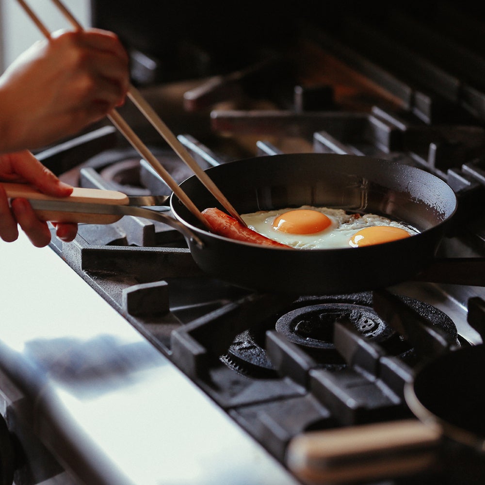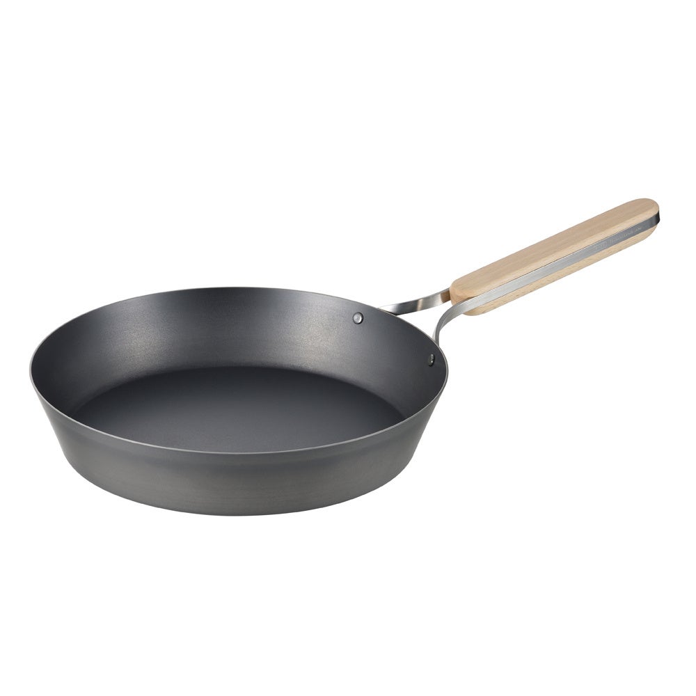 何度も実験を重ねてたどり着いた、熱がムラなく均等に伝わりやすい厚みを採用しました。大きな食材を入れられるよう底面は広く、ソースなどの流し込みを考慮して側面の立ち上がり角度は深く設計。強火でさっと調理ができる鉄材料だから、肉の旨味を逃さずに香ばしい焼き上がりに。特にステーキ調理で真価を発揮するフライパンです。