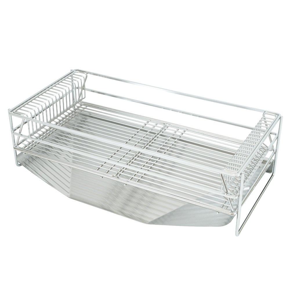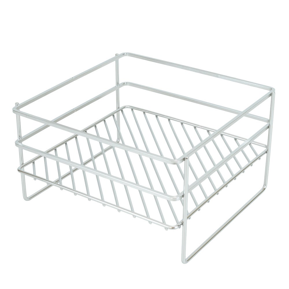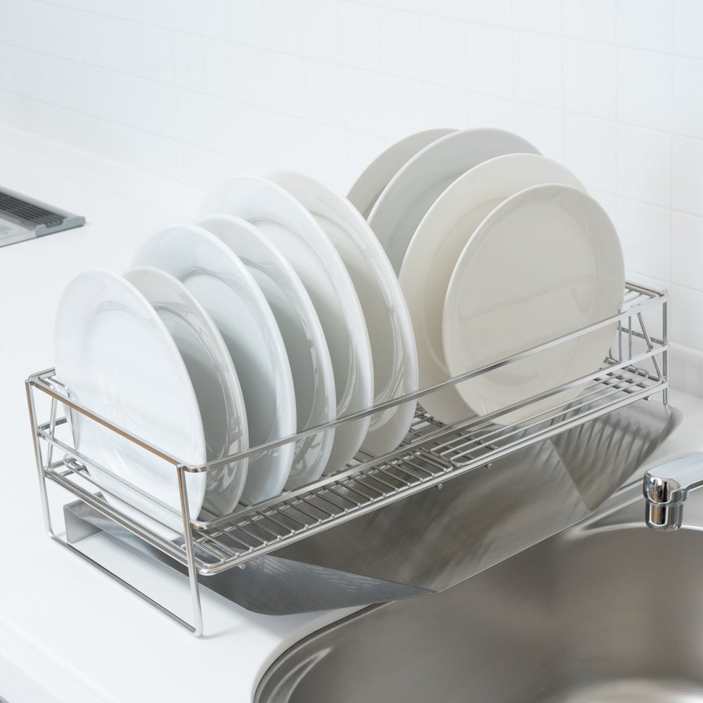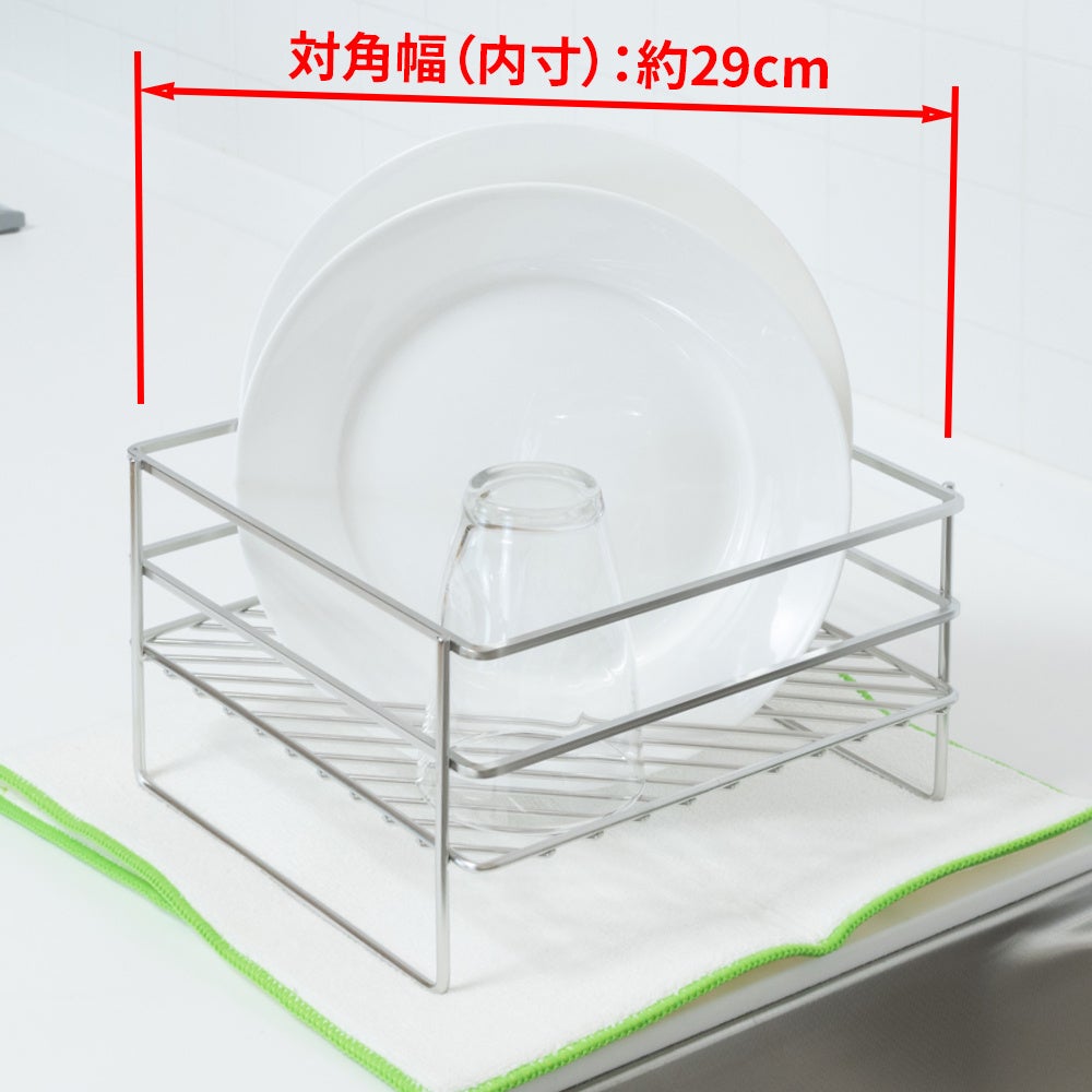 「ちょっと洗いに便利」コンパクト水切りかご。一般的な水切りかごと異なり、底面ワイヤーを45°斜めに配置。これにより、かごの対角線上のスペースを最大限に活用でき、コンパクトながらも大きめのお皿も安定して置けます。一人暮らしの方や、少量の洗い物をする方に最適です。
