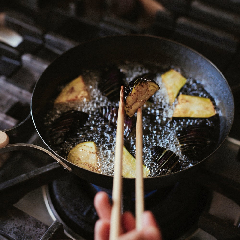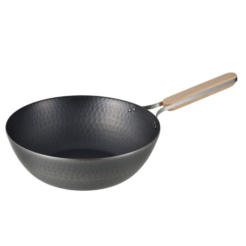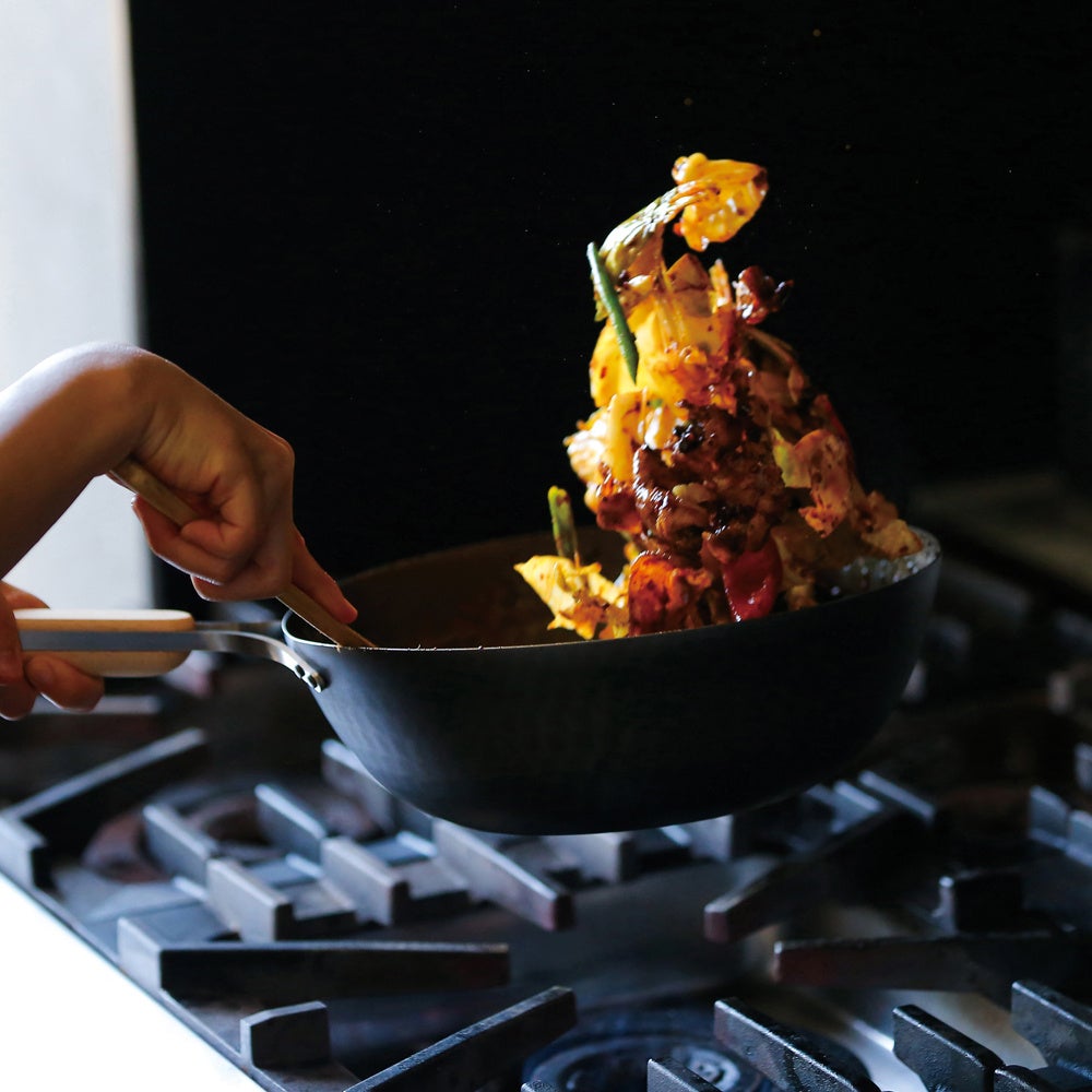 目指したのは、軽くて扱いやすい鉄の中華鍋。火力が命と言われる炒め料理には、加熱に強い鉄材料が最適ですが、重いのが難点です。そこで、従来とは異なる加工方法や昔ながらの製法などで試作を繰り返し、本製品にたどり着きました。鉄の良さを残しながら、限界まで重さを減らした中華鍋で、シャキシャキの野菜炒めが得意料理になりますように。