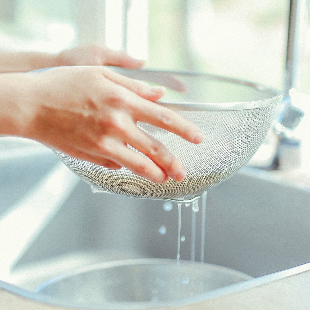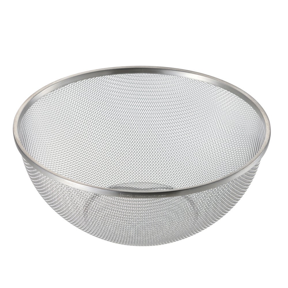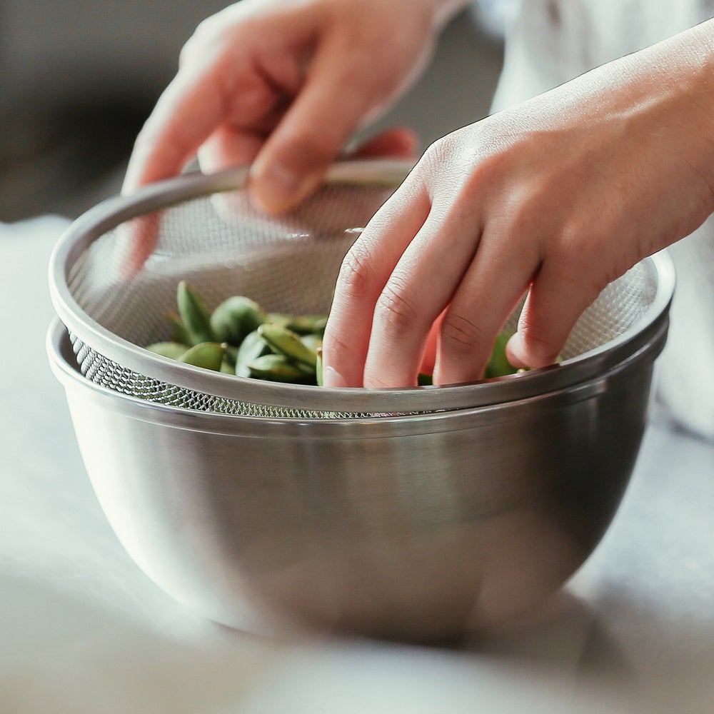 ざるの網目は、細かすぎると水切れが悪く、粗いと食材が漏れてしまいます。考えた最適解は、最も身近で最も小さい食材・お米が落ちずに洗える大きさです。さらに水切れの良さを保ちながら強度と見た目の美しさを追求しました。製造工場と幾度となく議論を重ねた末に完成した、「一生モノ」を目指したざるです。