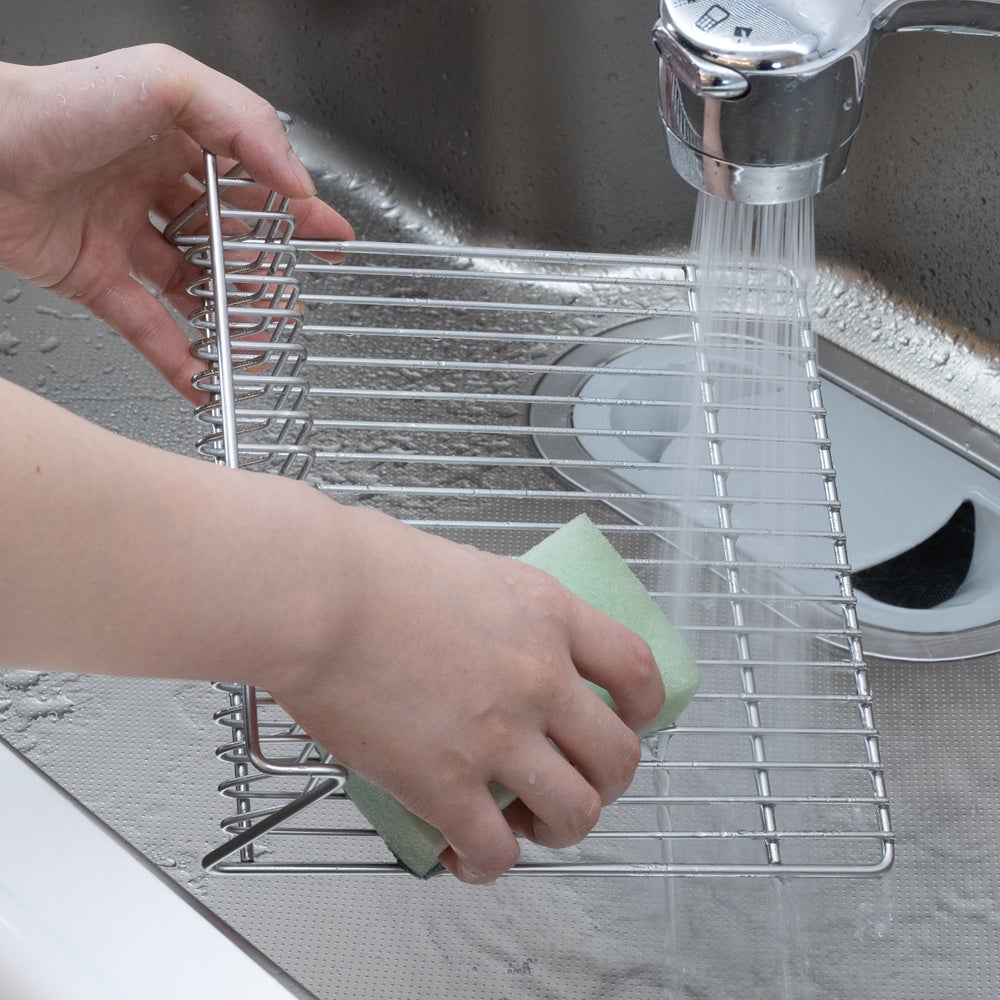 使いやすさにこだわり、底面のワイヤーピッチを細かくすることで、様々なサイズの洗い物を安定して置けるようにしました。 底面のワイヤーは分割・可動式のため、食器の形状に合わせて最適な向きで立てかけられ、効率よく水切りができます。 お手入れも簡単です。すのこ部分は簡単に取り外せるので、シンクで手軽に丸洗いが可能。水切りトレーも、継ぎ目のないシンプルな一枚板構造で汚れが溜まりにくく、サッと拭くだけで清潔に保てます。