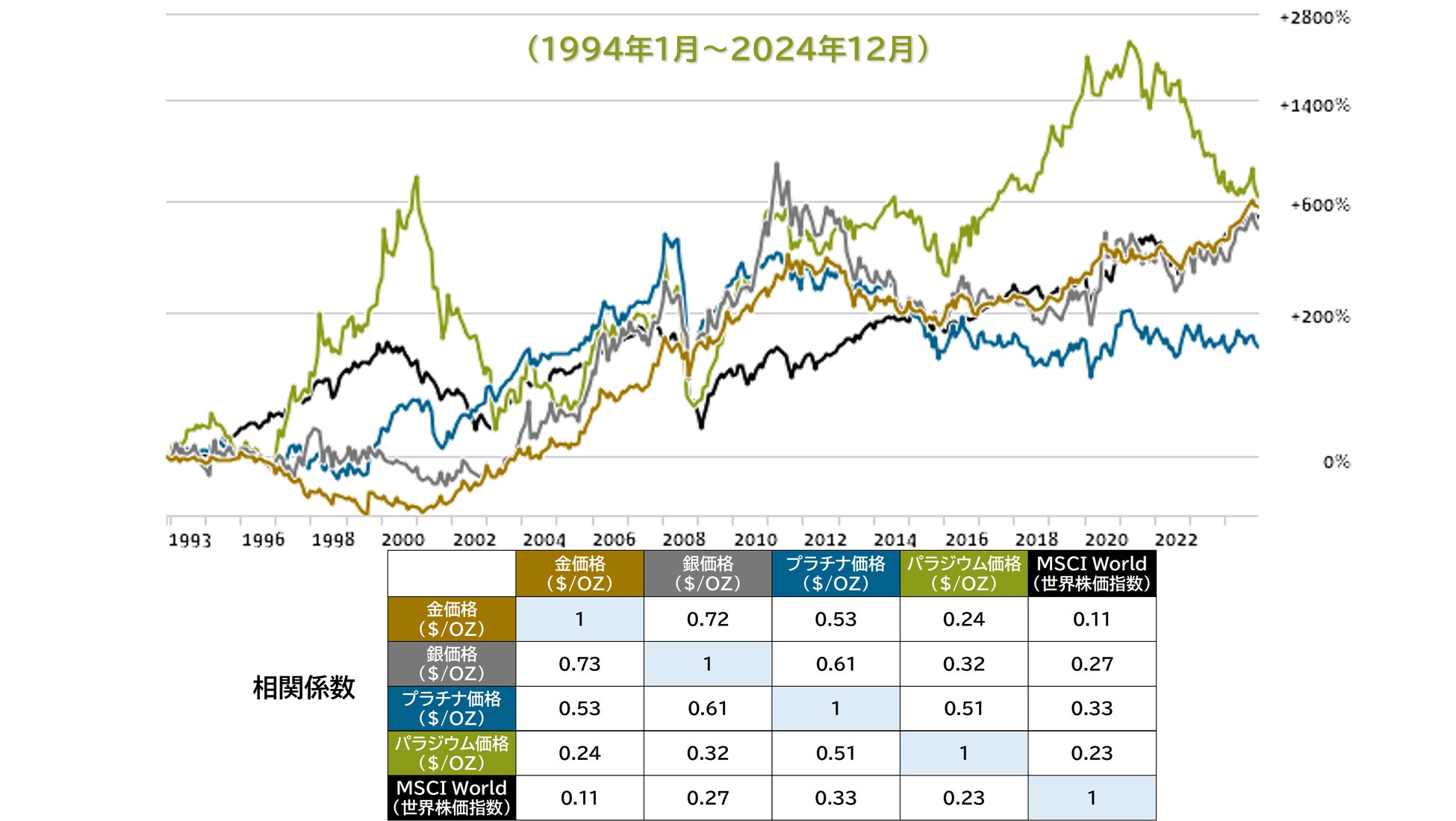 プレシャスメタルと株式の相関係数が低いということは、互いに補完し合う資産であることを示しており、分散効果を高めるうえで有効であるといえます