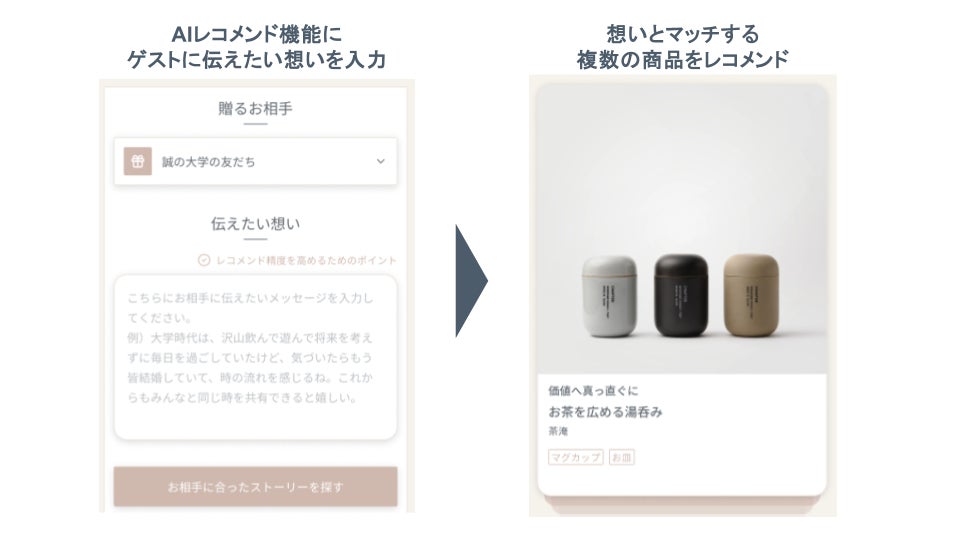 新郎新婦がゲストに伝えたい「想い」を入力すると、それにふさわしいつくり手のストーリーとギフトをAIがレコメンド。この機能により、新郎新婦は、ギフトを選ぶ手間を最小限に抑えながら、ゲストに想いを伝えることができます。