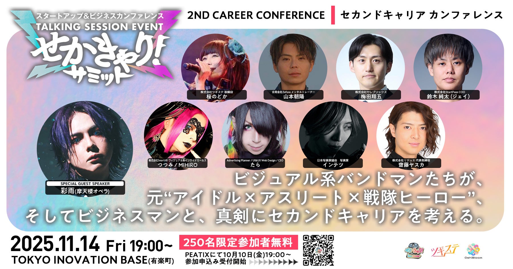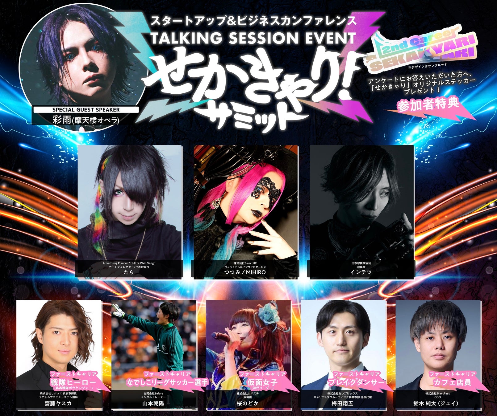 本イベントは、ビジュアル系バンドマンや元"アイドル、アスリート、戦隊ヒーロー"など、多様なキャリアを歩んできた登壇者たちと「表現者の経験が社会にもたらす効果」や「セカンドキャリア人材の可能性」について共に考えることを目的としています。