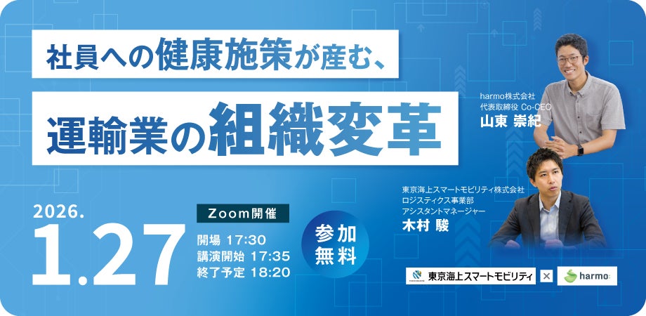 東京海上スマートモビリティ株式会社(本社:東京都千代田区、代表取締役社長:原田秀美、以下「東京海上スマートモビリティ」)は、2026年1月27日(火)にharmo株式会社(本社:東京都港区、代表取締役Co-CEO 山東 崇紀、代表取締役Co-CEO 内上 昌裕、以下「harmo」)と「社員への健康施策が産む、運輸業の組織変革 ~健康管理DXから始める 事故防止と、事業成長の道~」ウェビナーを開催します。