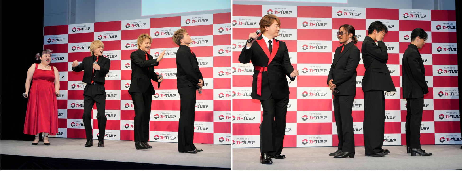 その後、ステージ演出として、イメージキャラクターに初就任した渡辺直美さん、2年目を迎えた香取慎吾さんと3年目を迎えたGENERATIONSのメンバーによる「カープレミア ジェスチャー伝言クイズ対決」を行い、8名が2チームに分かれて勝負を行いました。