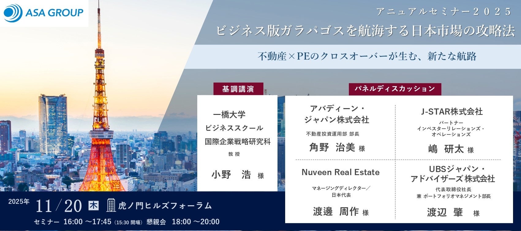 ASAグループは、2025年11月20日(木)に「アニュアルセミナー2025」を虎ノ門ヒルズフォーラムにて開催いたします。本セミナーは、海外投資家にとって依然として高い参入障壁を持つ日本市場をテーマに、理論と実務の両面から多角的な議論を展開します。国内外の投資家・事業者をつなぐハブとして、ASAグループは業界の発展に貢献するセミナーを定期的に開催しています。今回も、日頃お世話になっているお客様に向けて、より深いビジネス洞察を提供できる機会となります。