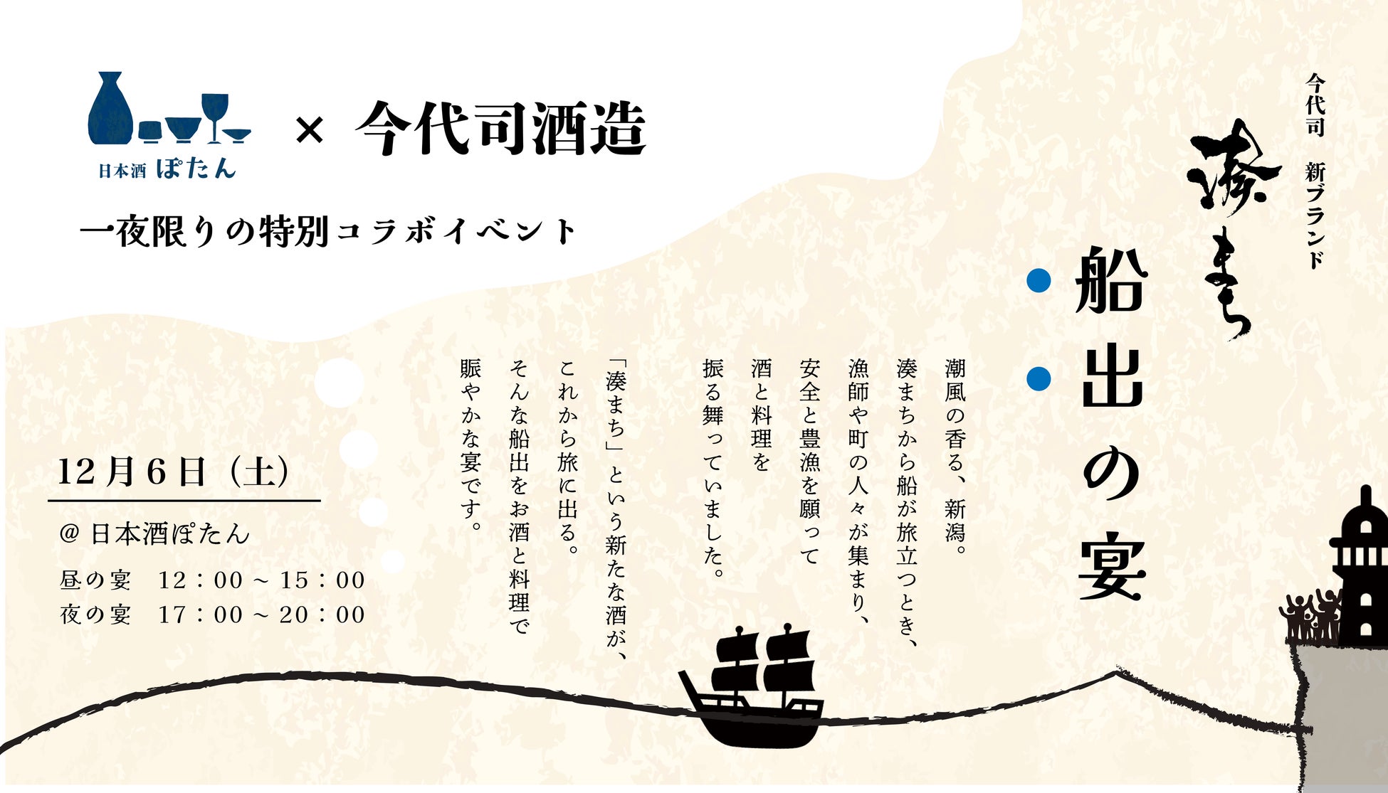ぽたん株式会社(本社:大阪市福島区福島2-7-24 4F、代表取締役:久米 佑宜)が運営する)大阪・福島の日本酒専門店「日本酒 ぽたん」にて、今代司酒造株式会社(所在地:新潟市中央区)が手がける新ブランド「湊まち」の一日限りのコラボイベント「湊まち 船出の宴」を2025年12月6日(土)に開催します。
