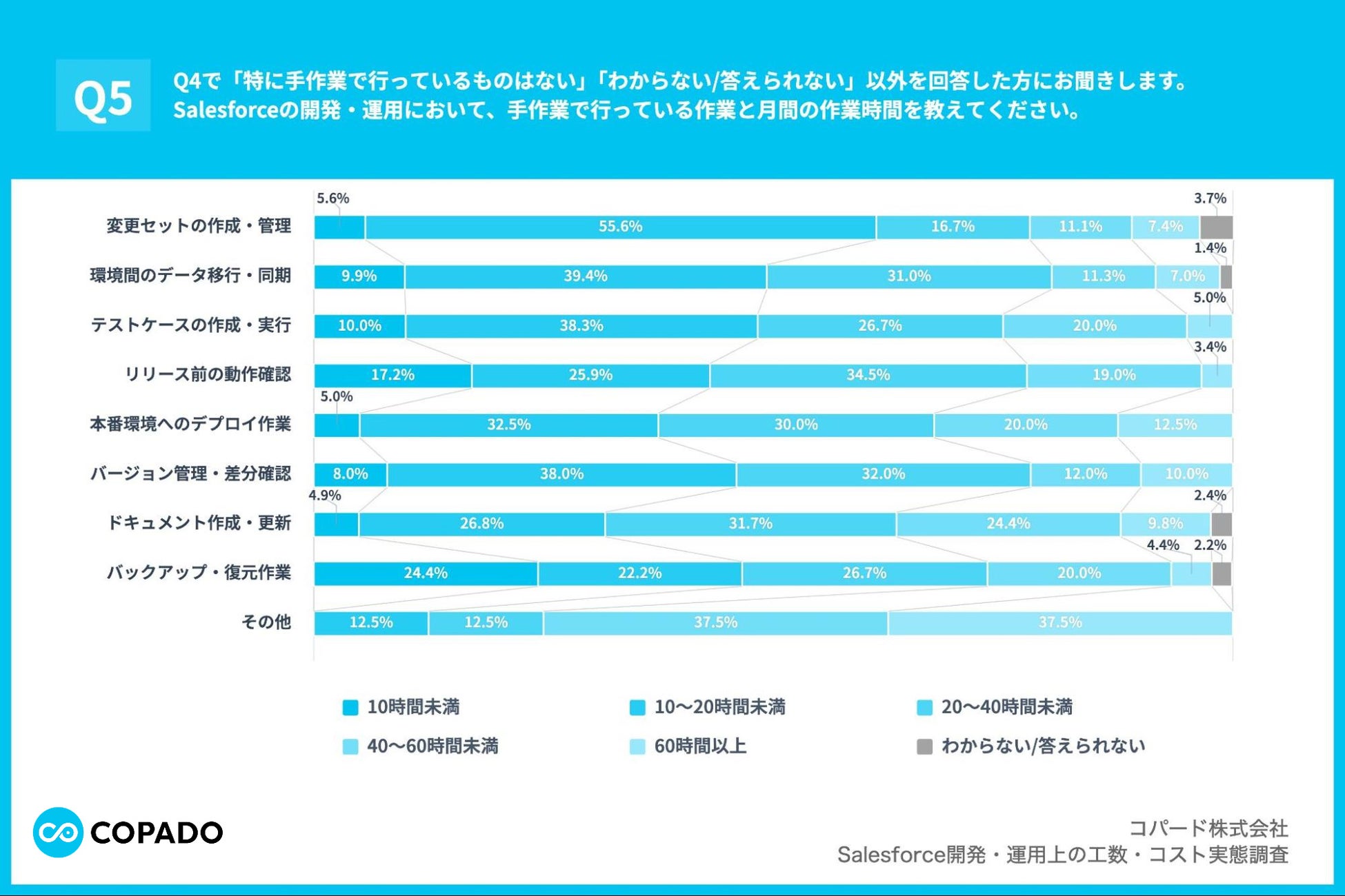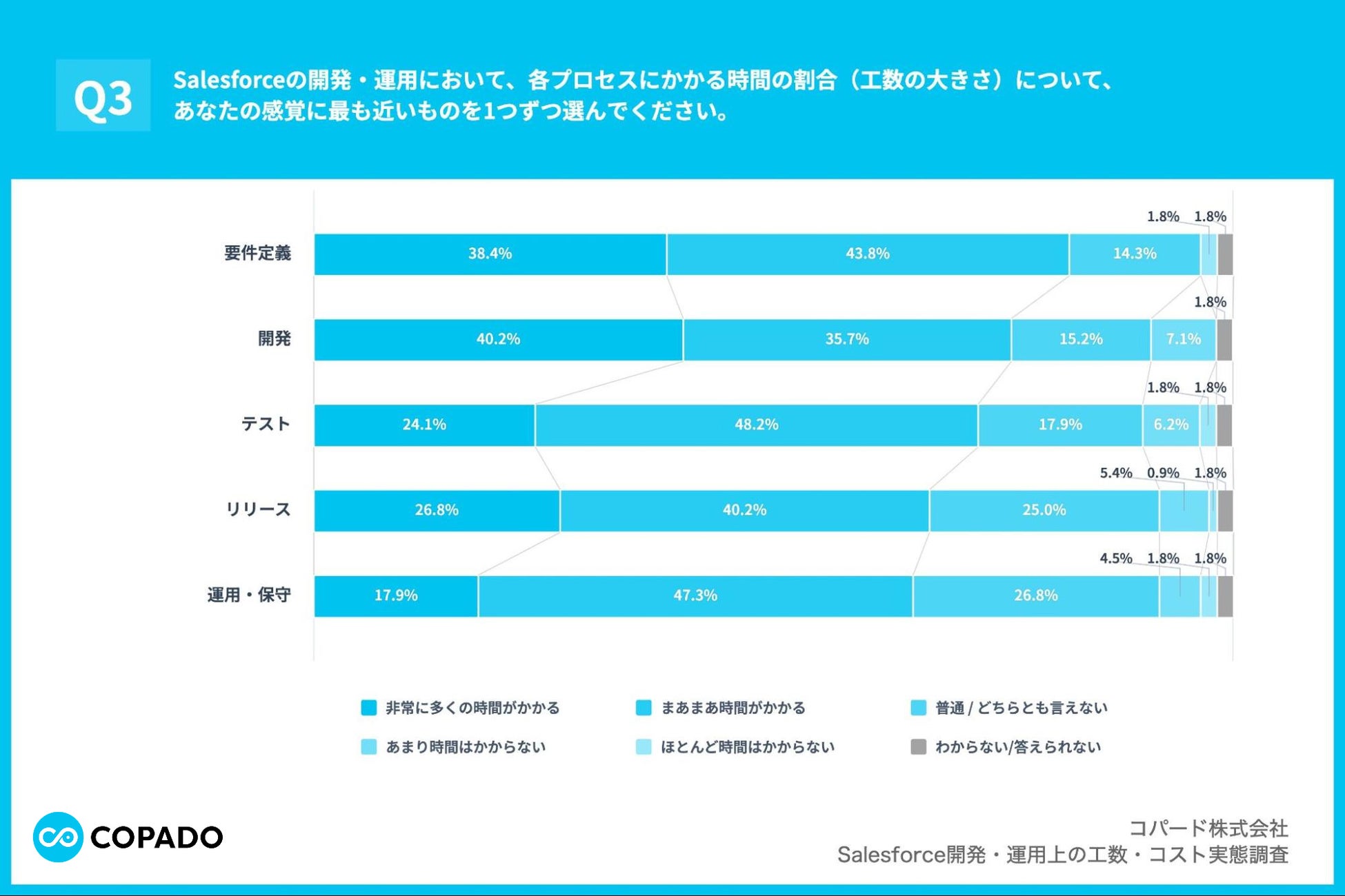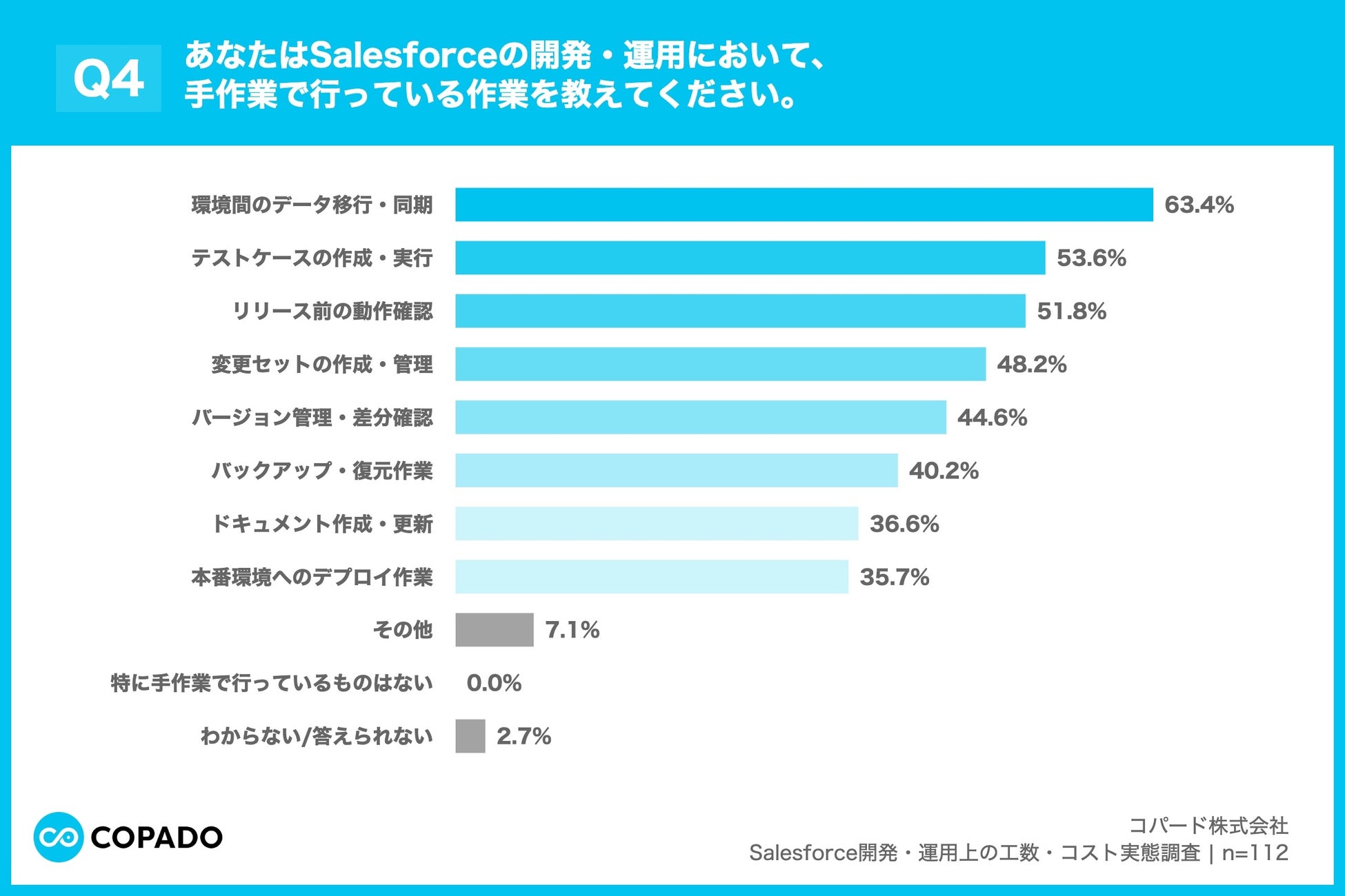 コパード株式会社(本社:東京都千代田区、代表取締役:舟越 美宝、以下「Copado」)は、Salesforce導入企業の情報システム部門・DX推進部門において、Salesforceの開発・運用業務に携わる担当者112名を対象に、開発・運用上の工数におけるコスト実態調査を実施しましたので、お知らせいたします。