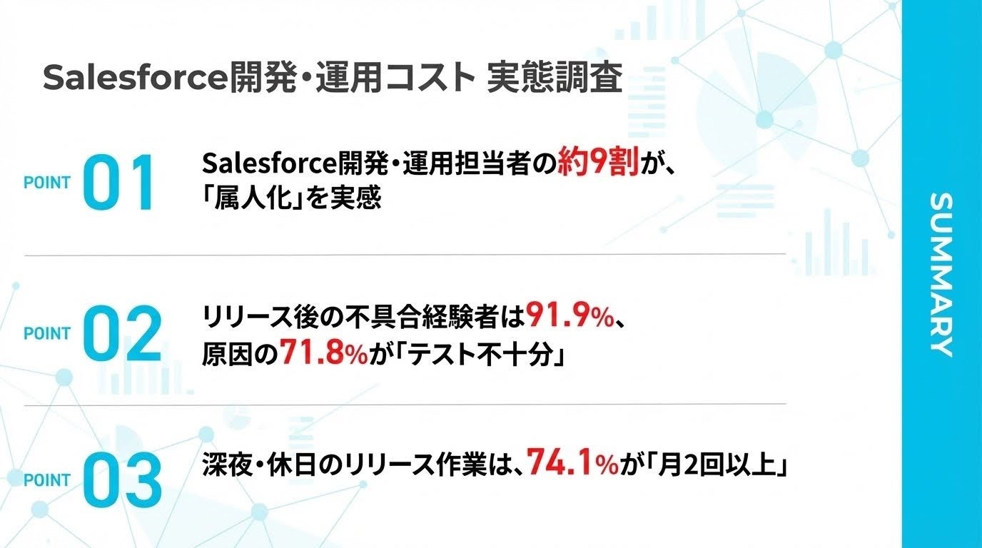 本調査により、Salesforceの開発・運用現場が「手作業の常態化」「深夜・休日作業の頻発」「属人化」という三重苦に直面し、膨大なリソースコストを浪費している実態が明らかになりました。