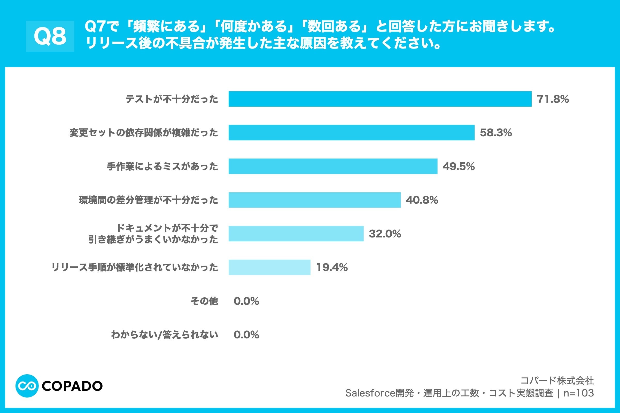 リリース品質とコストの関係では、91.9%がリリース後の緊急対応や手戻りを経験していると回答。その原因は「テスト不十分」(71.8%)が最多で、次いで「変更セットの依存関係の複雑化」(58.3%)、「手作業ミス」(49.5%)と続きます。