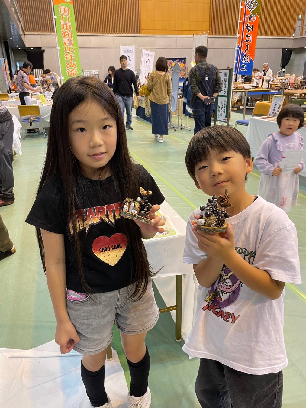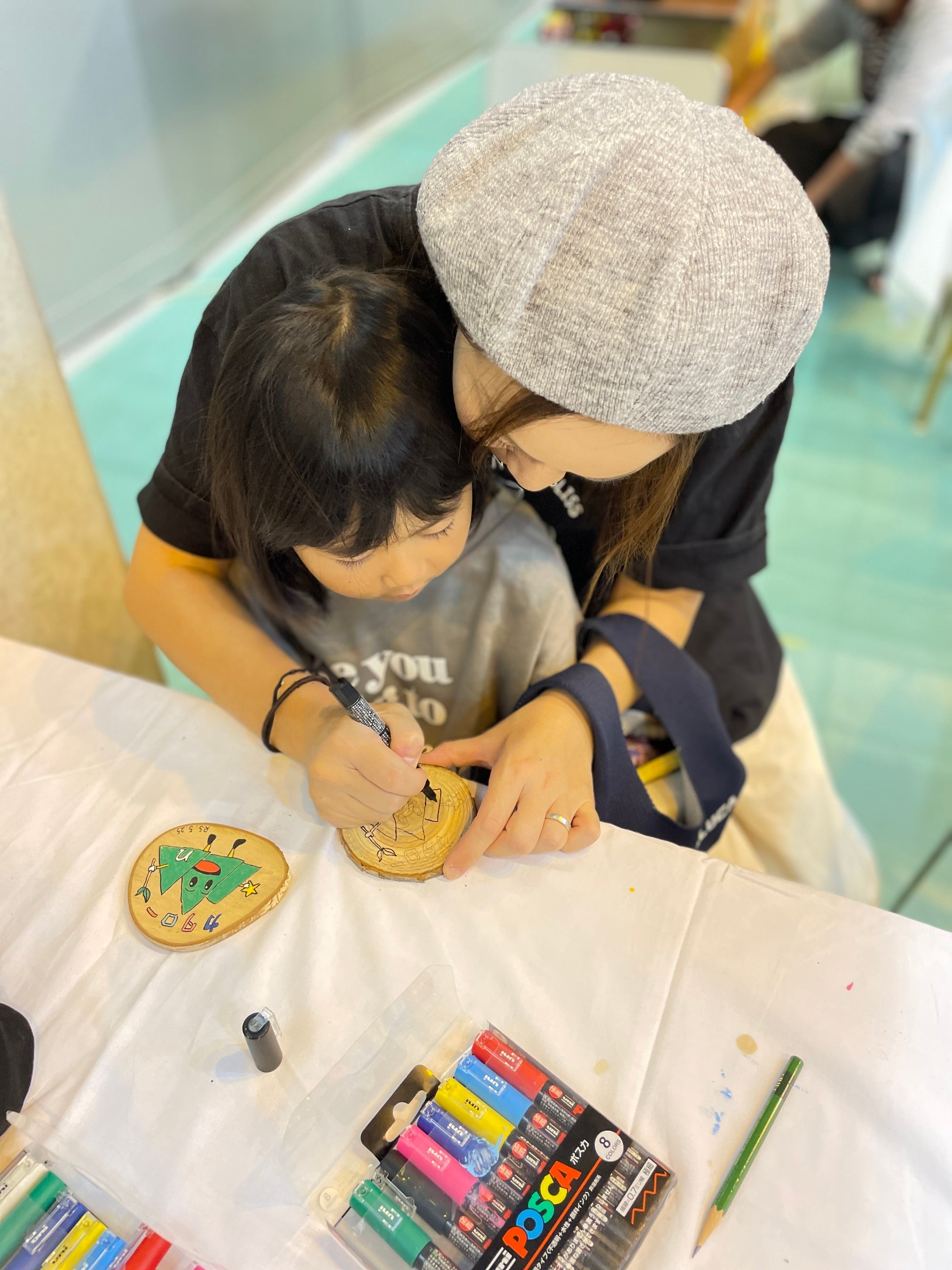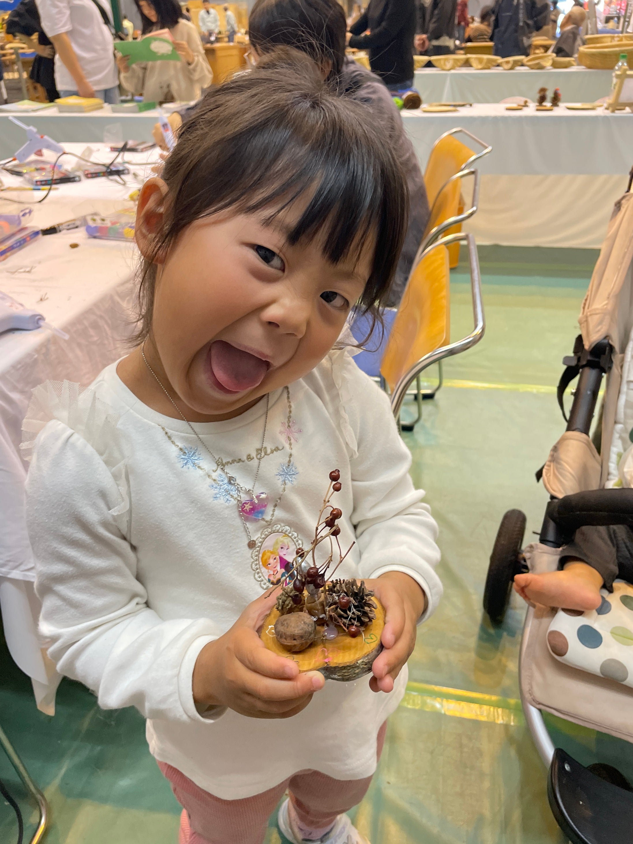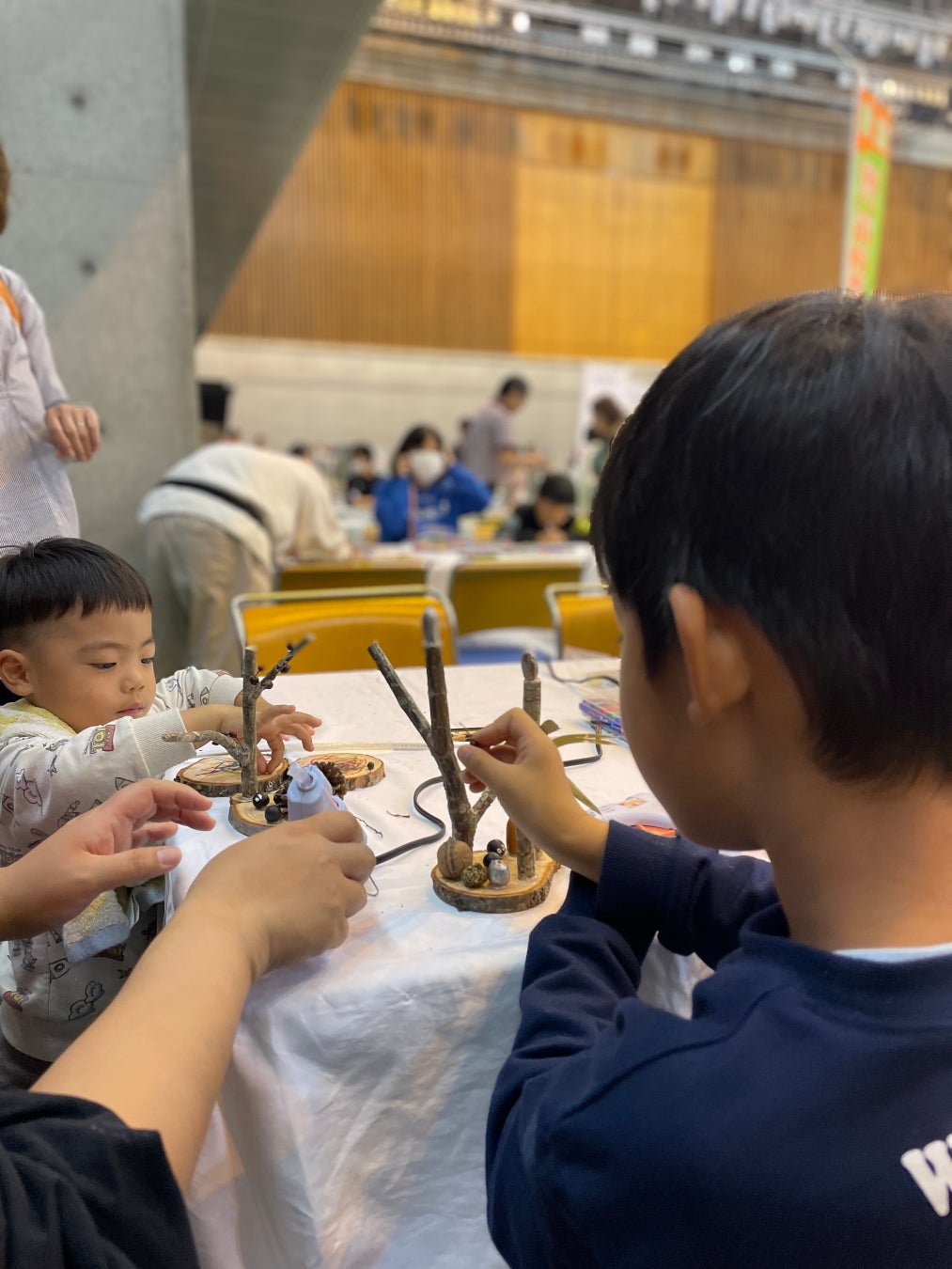 当施設のブースでは、森に囲まれた施設の持ち味を知ってもらうためにも、ウッドコースター作り、ウェルカムボード作り、アースクラフト(木の実や葉っぱを自由に組み合わせてつくる置型の飾り物)の3種類のクラフトを提供しました。